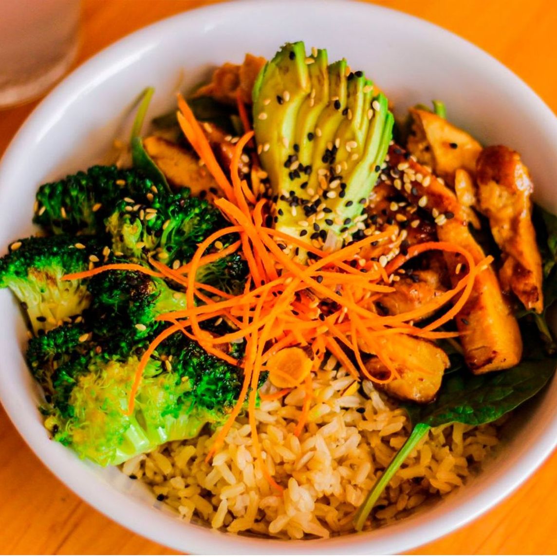 Brócoli, almendras, aguacate, espinacas, zanahoria, ajonjolí más salsa teriyaki.
