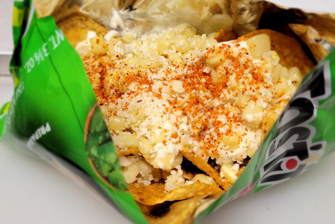 Elote en vaso con queso amarillo acompañado de tostielotes.
