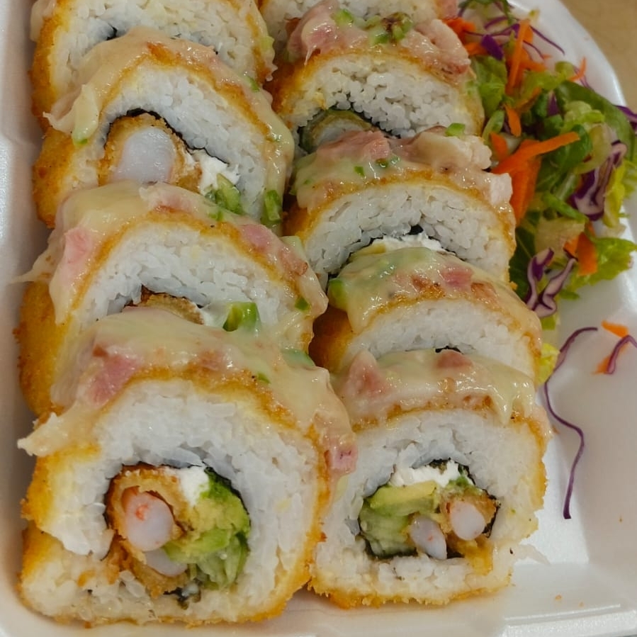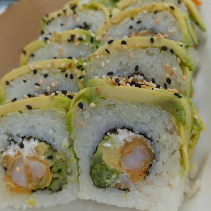 Camarón empanizado, Philadelphia. Por fuera forrado de aguacate