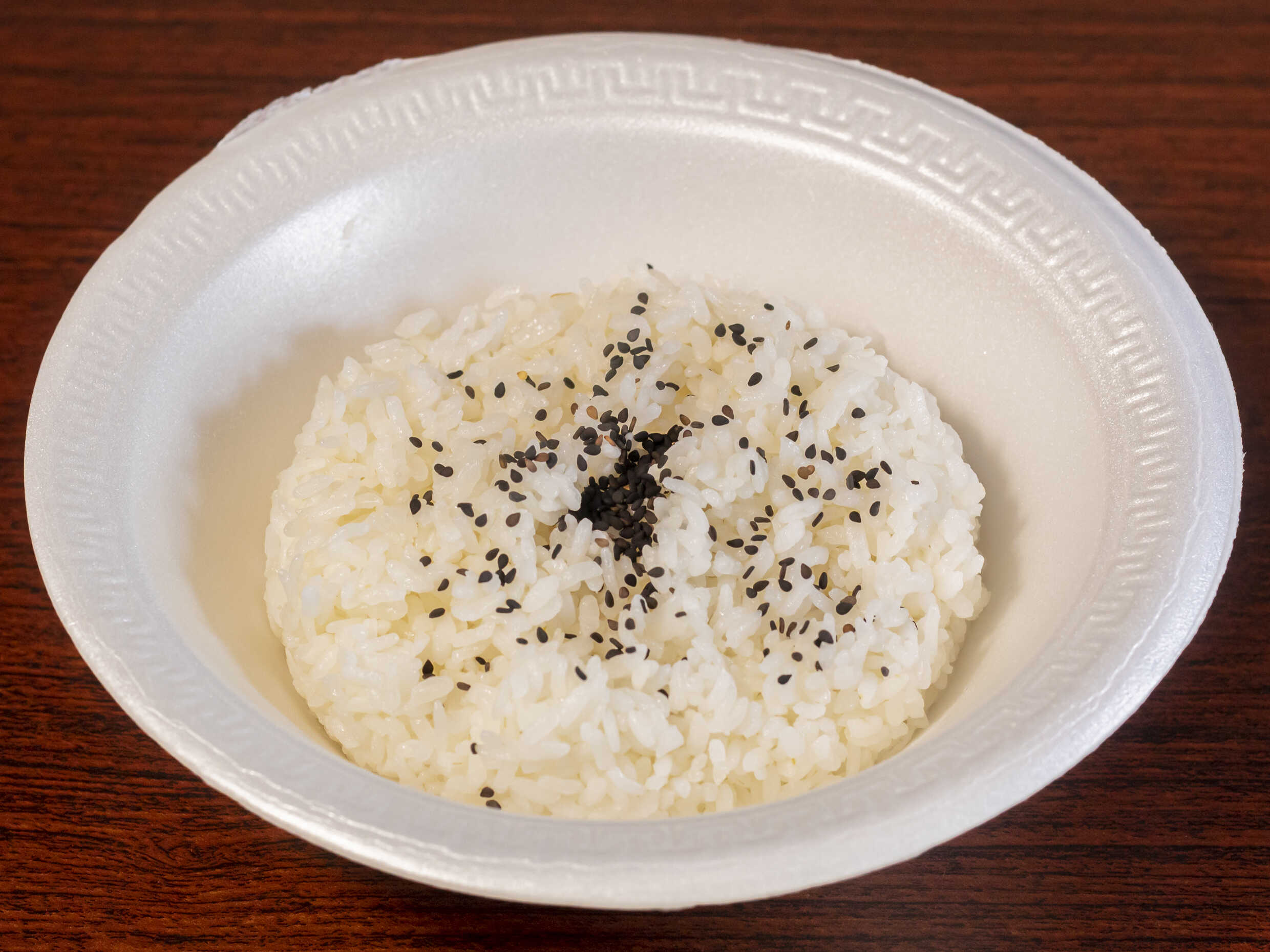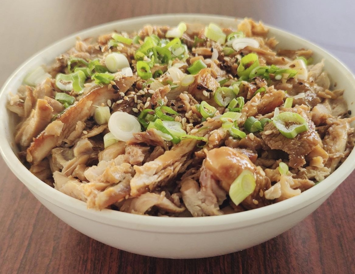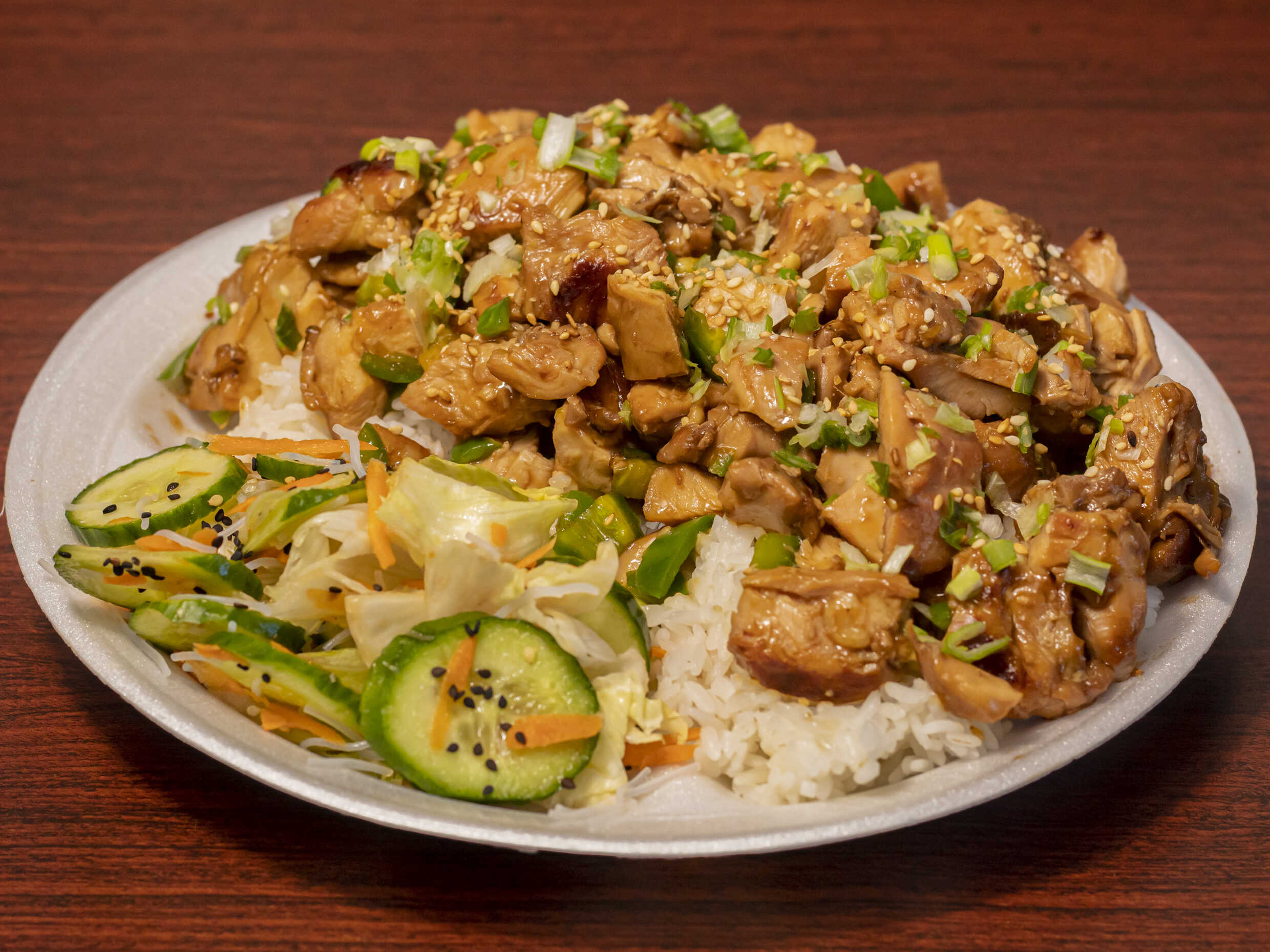 Tazón de arroz blanco con pollo teriyaki al top, ajonjolí y cebollín.