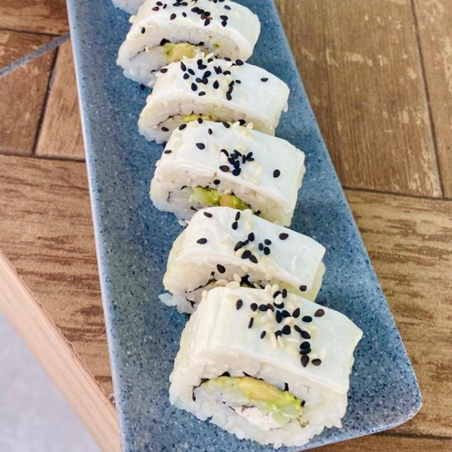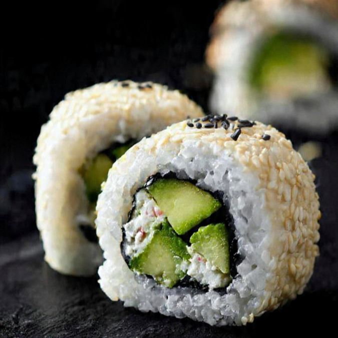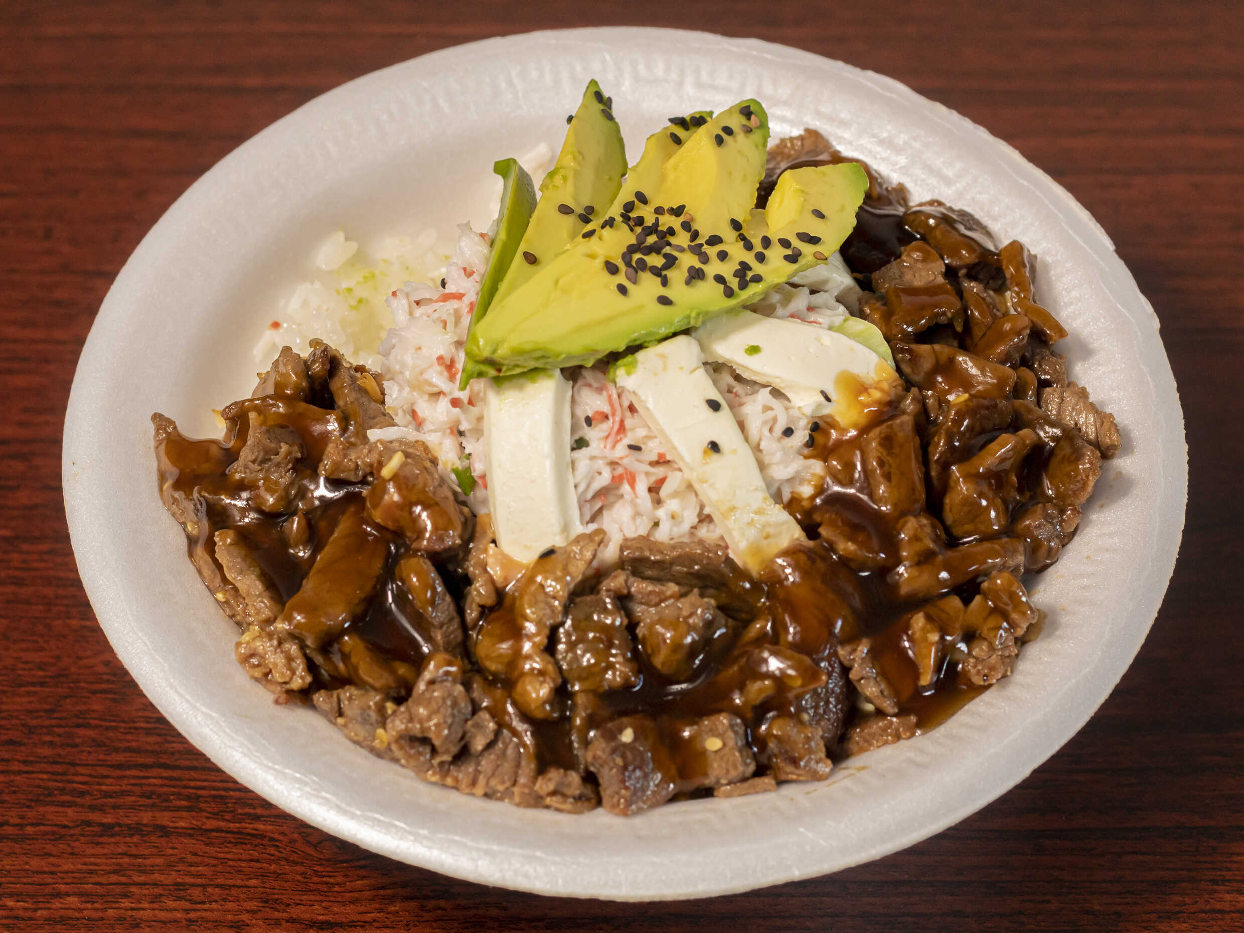Tazón de arroz con top de ensalada surimi, abanico de aguacate y ajonjolí.