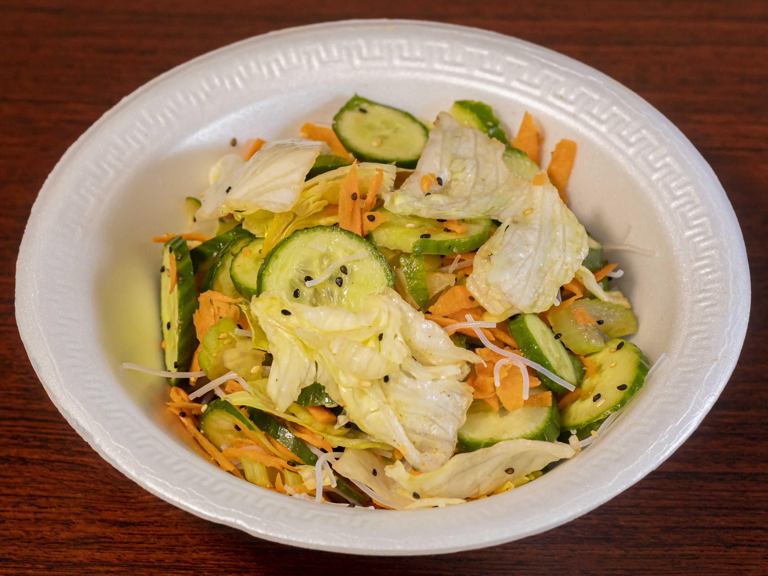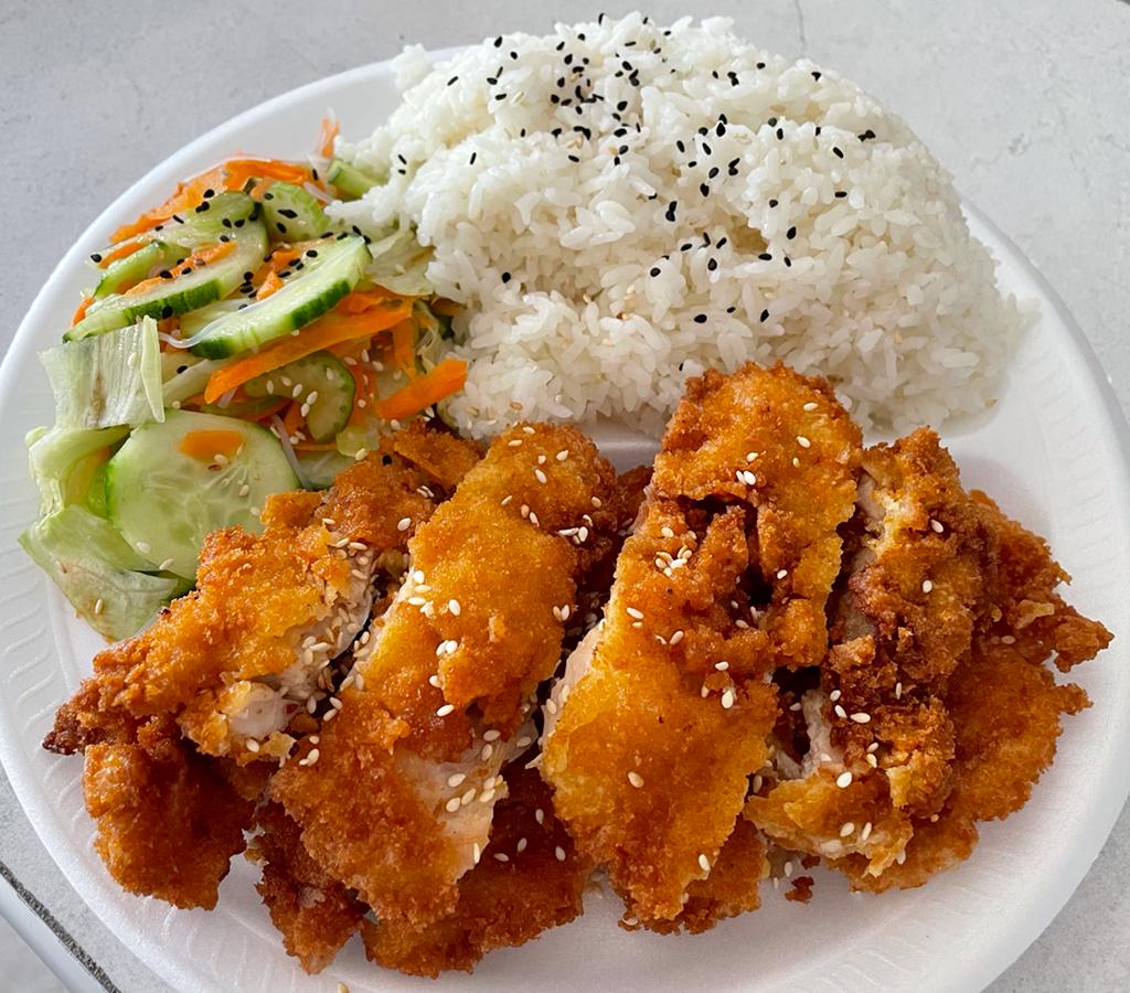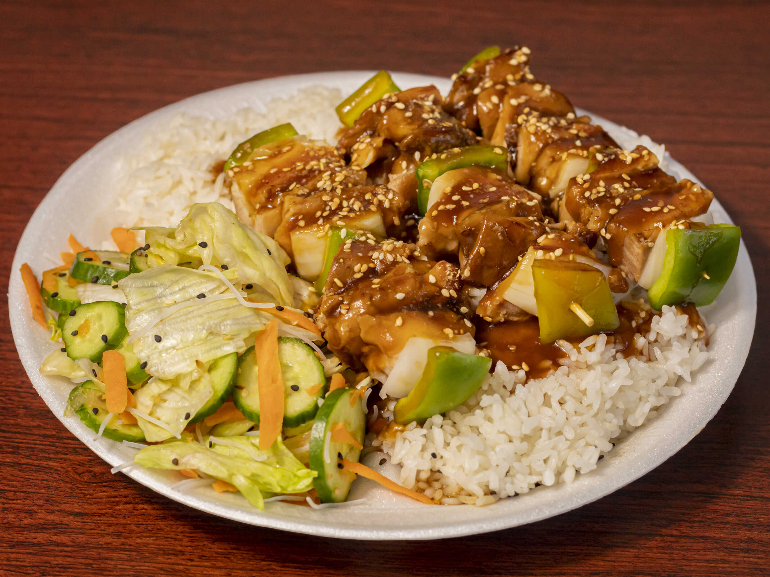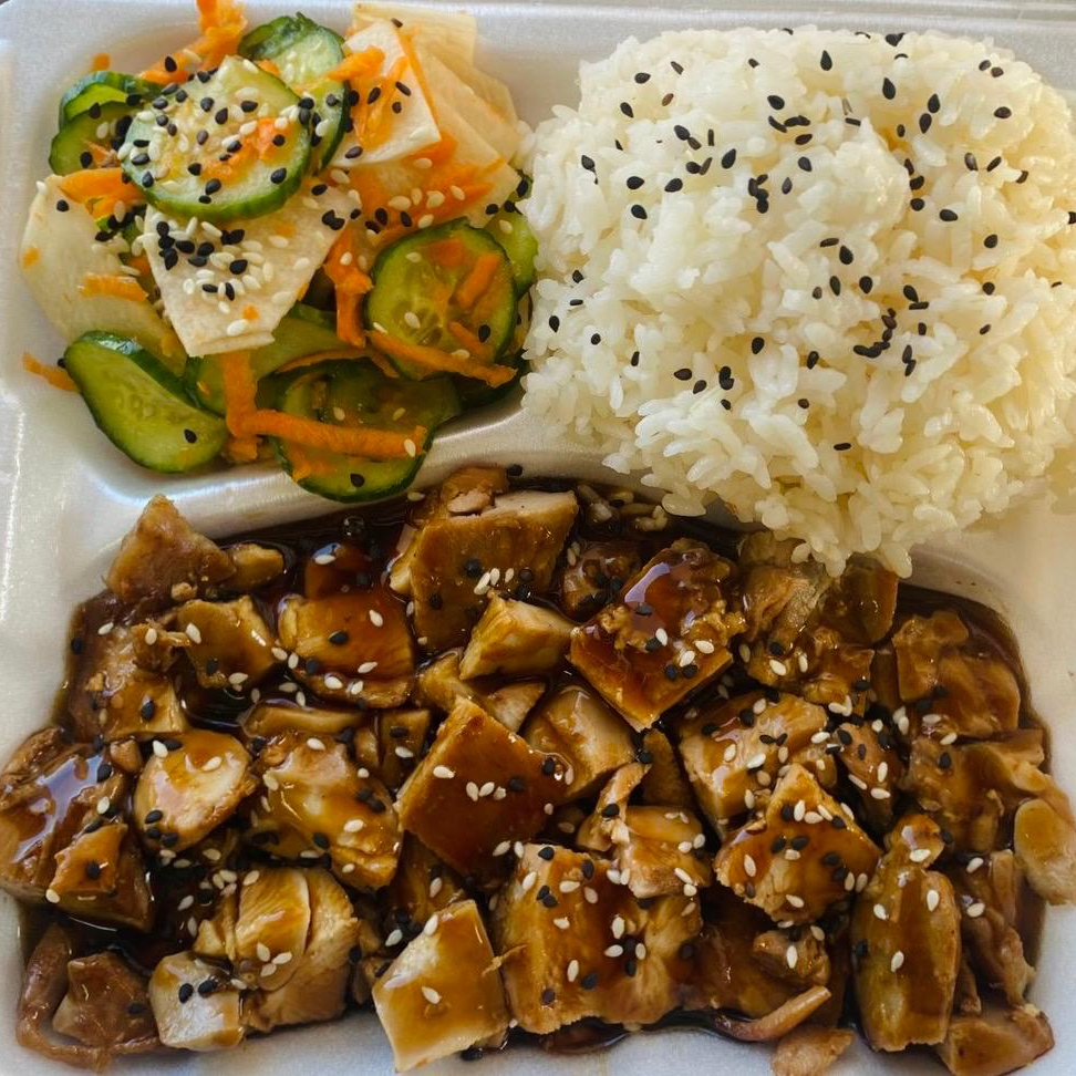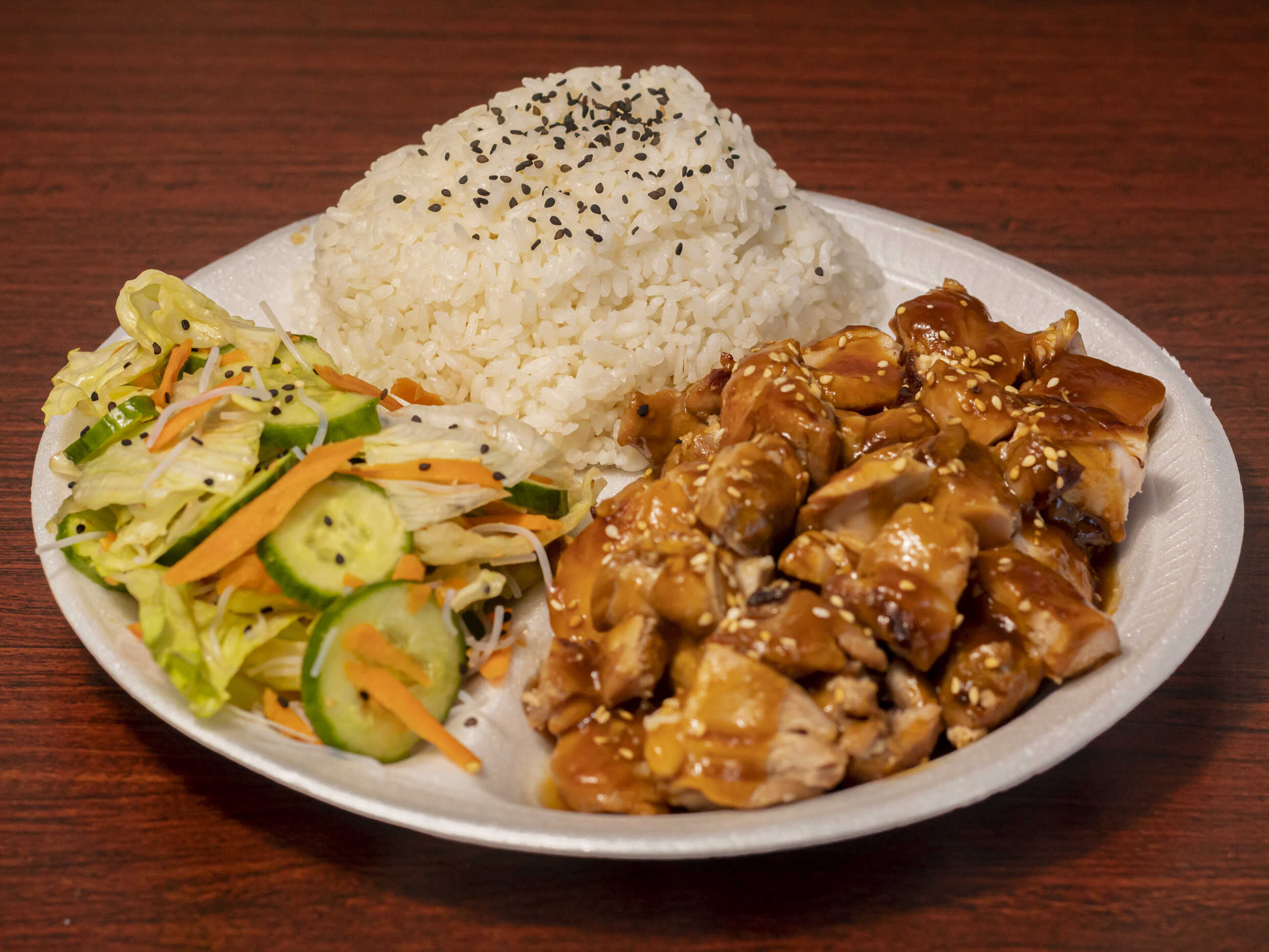 Pollo teriyaki acompañado de ensalada kyuri y arroz blanco con ajonjolí negro al top.