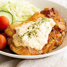 Pechuga de pollo frito en salsa nanban, salsa tártara y arroz.