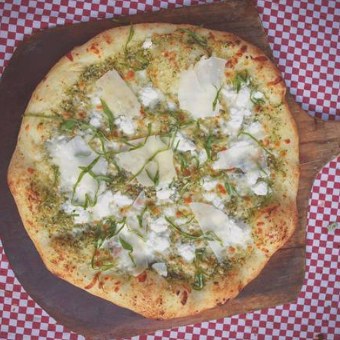 Pesto, queso de cabra, mozzarella, láminas de parmesano y albahaca fresca.