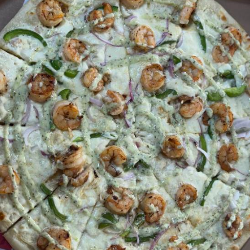 Salsa alfredo, queso, camarones, aderezo de cilantro, cebolla, chile serrano y chile California.