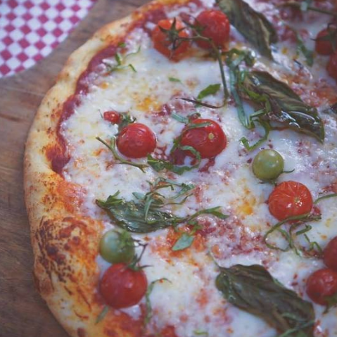 Salsa de tomate, albahaca, tomate, queso mozzarella y aceite de oliva.