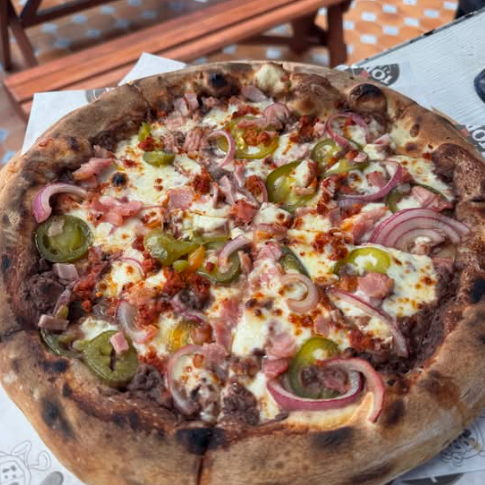 Pizza colaboración con Mariscos El Ángel. Salsa chipotle, queso mozzarella, generosa porción de marlín ahumado, pimientos y cebolla morada.