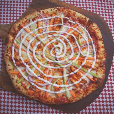 Salsa de tomate, zanahoria, queso mozzarella, apio, pollo con búfalo, salsa búfalo y aderezo ranch.