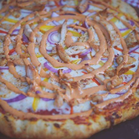 Salsa de tomate, queso mozzarella, pollo, pimiento, cebolla, aderezo chipotle y tortilla dorada de maíz.