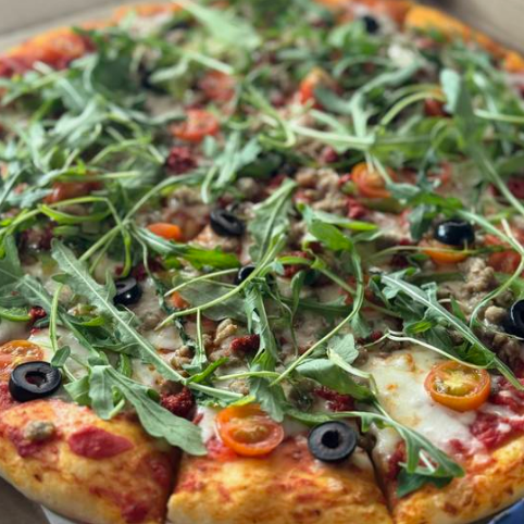 Salsa de tomate, queso mozzarella, salchicha italiana, chorizo, aceituna negra, chile California, tomate churro y arúgula.