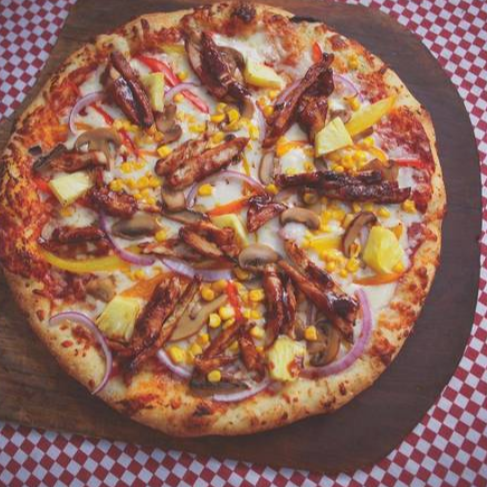 Salsa de tomate, queso mozzarella, pollo BBQ, pimiento, cebolla, piña, champiñones y elote.