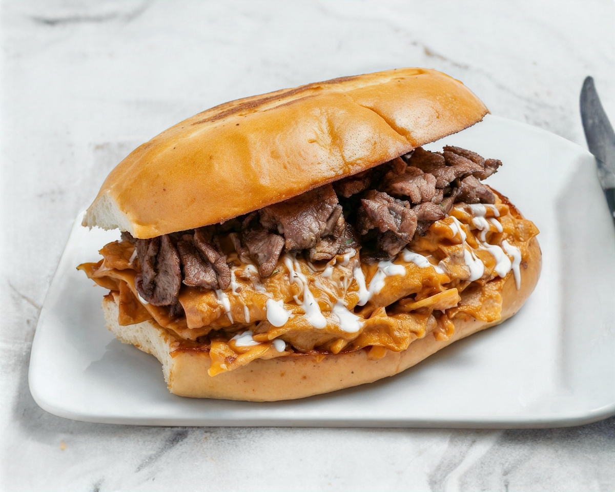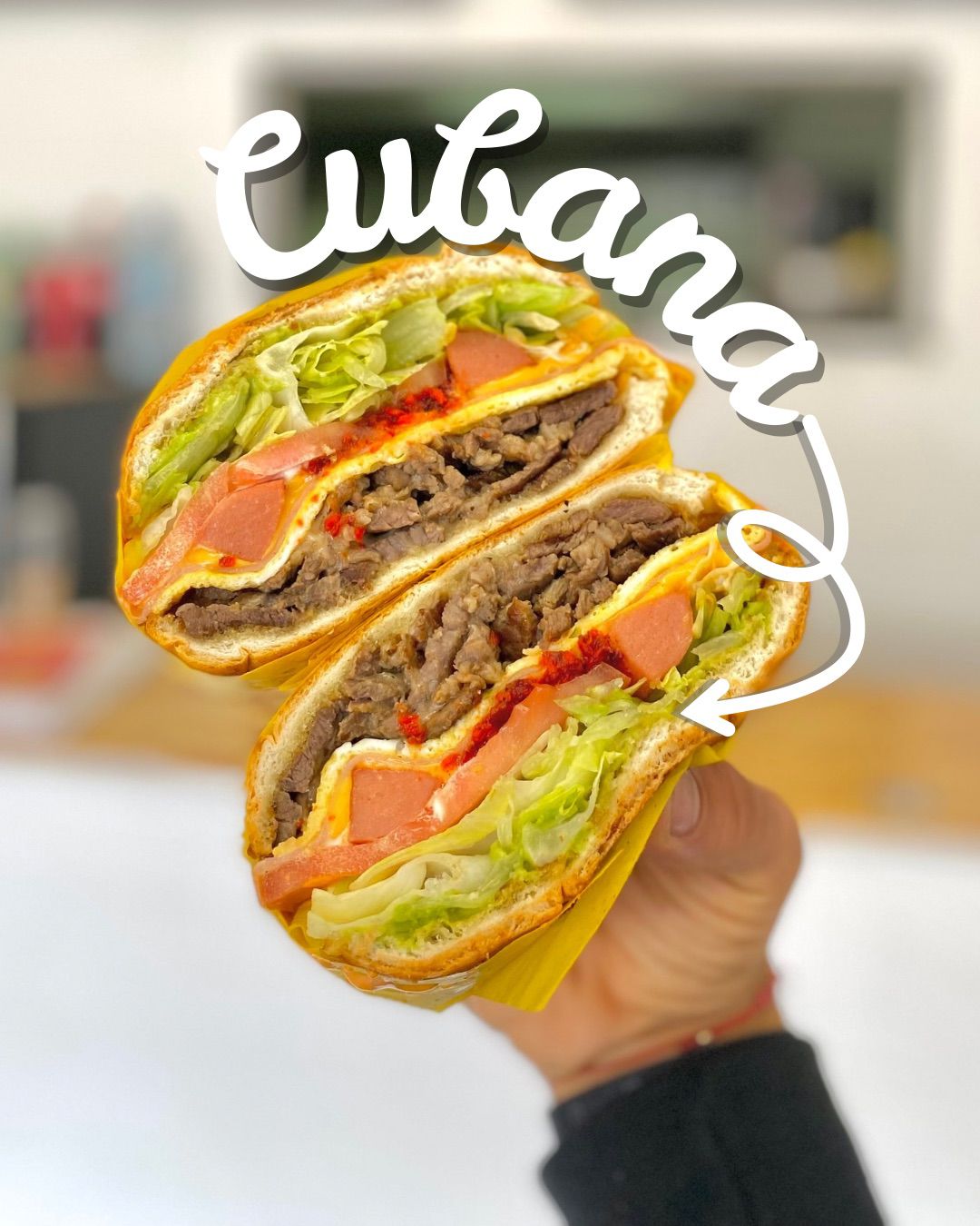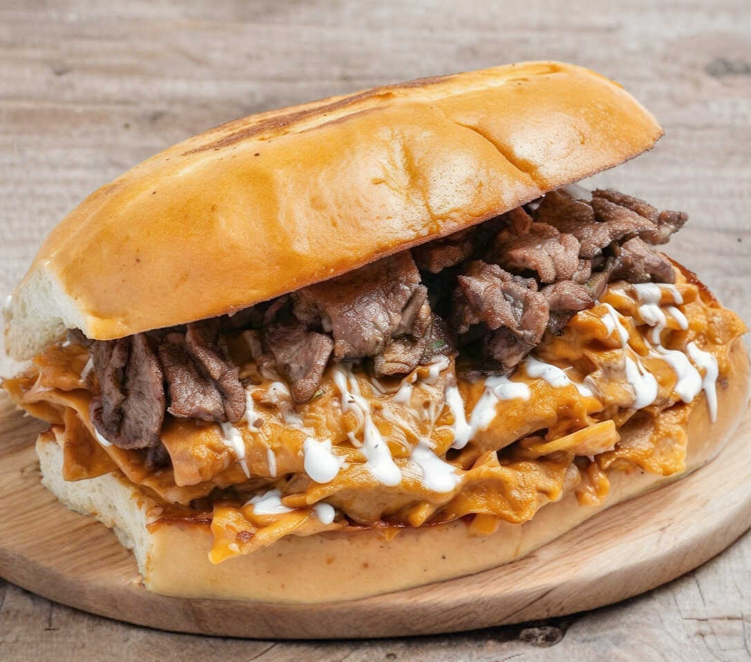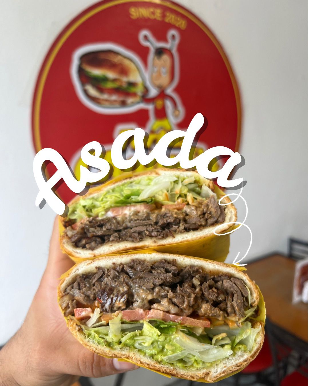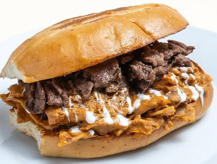 Carne Asada, queso, mayonesa, lechuga, tomate, cebolla, agucate