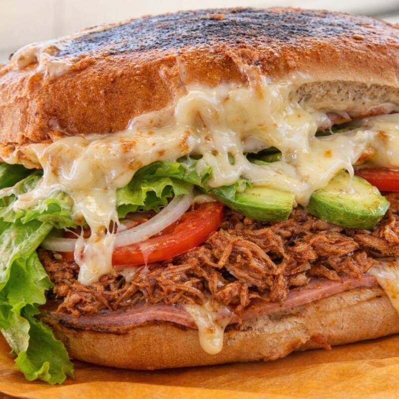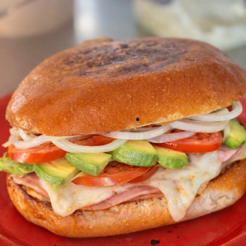 Rica pierna jugosa, jamón a la plancha, queso monterrey, mayonesa, aguacate, lechuga, tomate y cebolla curtida