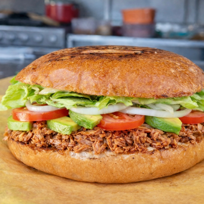 Torta de frijol puerco casero, estilo Sonora, en pan dorado con aguacate, queso monterrey y zanahoria en escabeche