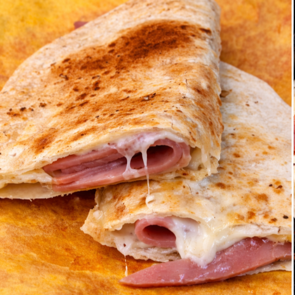 Tortilla de harina dorada (tamaño normal) con jamón y queso monterrey
