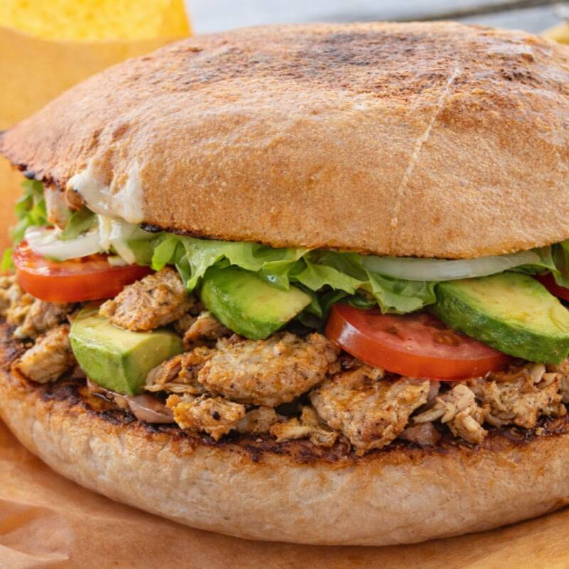 Pechuga de pollo en trozos sazonada, mayonesa, aguacate, lechuga, tomate y cebolla curtida