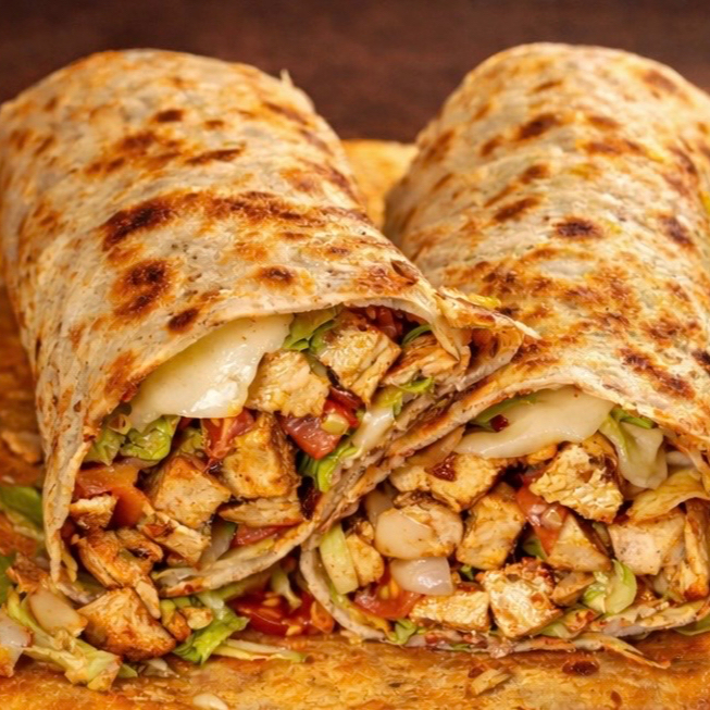 Tortilla de harina dorada (tamaño grande), pechuga de pollo en trozos sazonada, queso monterrey, lechuga, aguacate, tomate, cebolla curtida y salsa chipotle