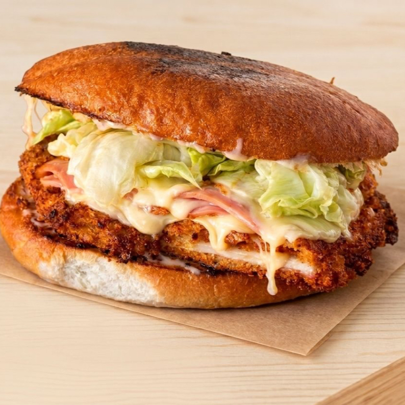 Milanesa de pollo crujiente rellena de jamón y queso monterrey, mayonesa, aguacate, lechuga y tomate