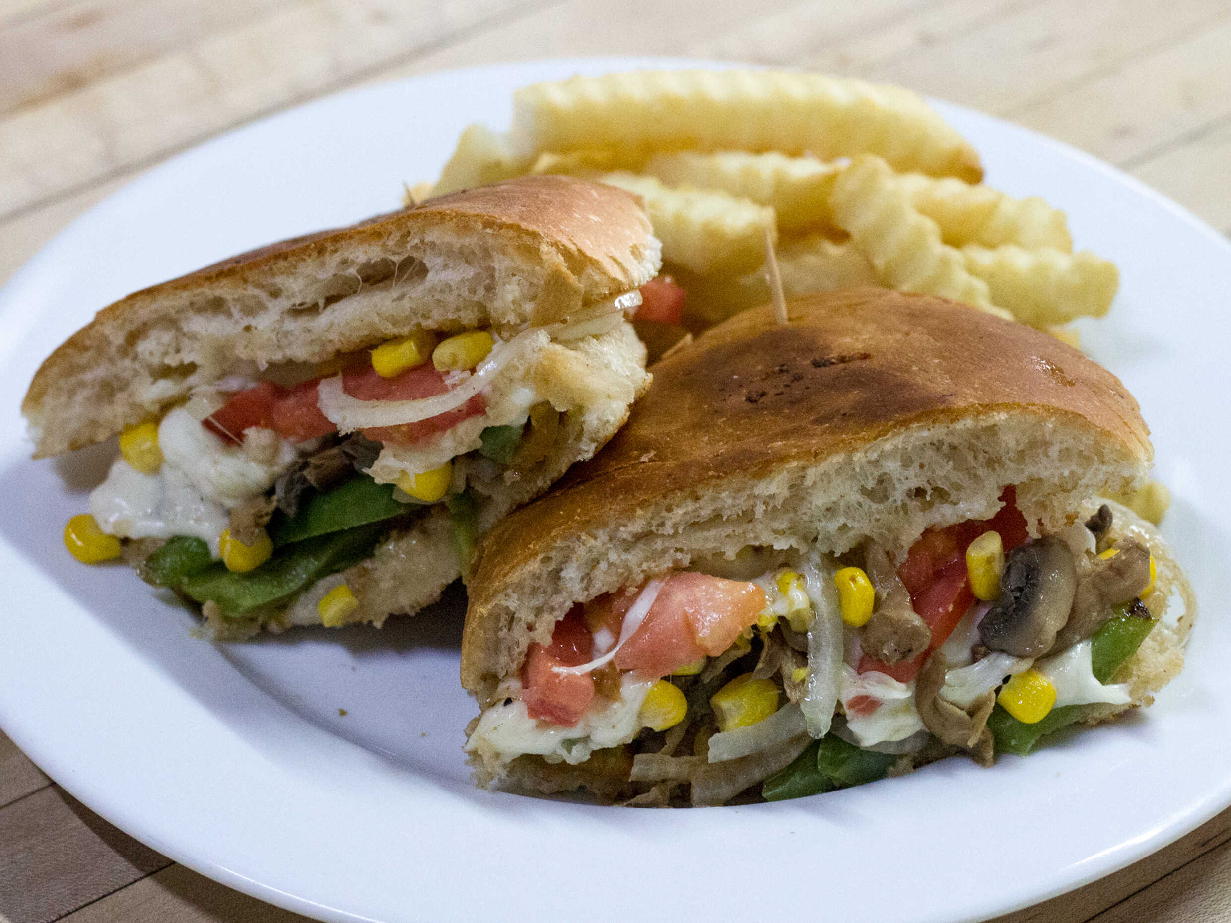 Chile california, champiñones, tomate, cebollita asada, elote amarillo, aguacate y queso oaxaca