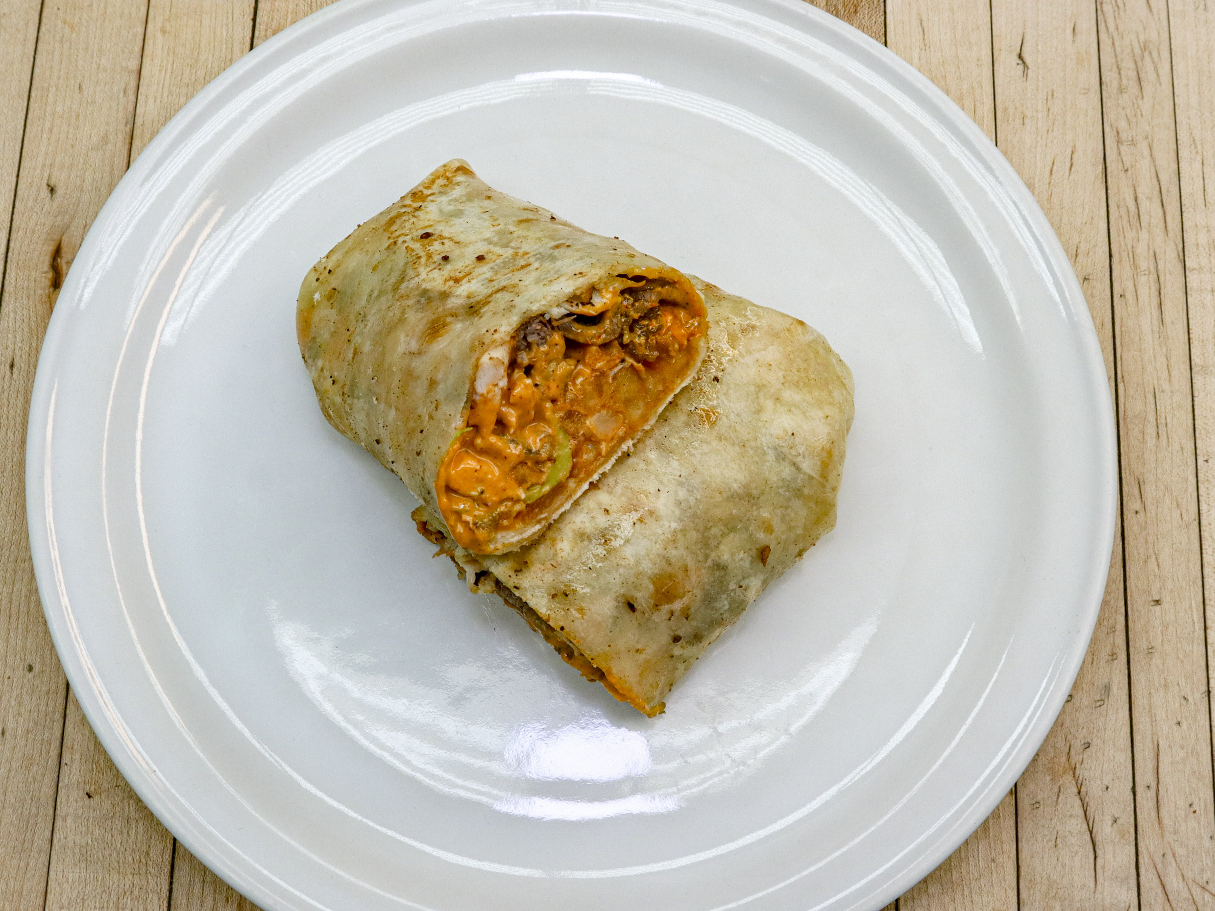 Burro de Peshuga asada, chorizo, tomate, aguacate y aderezo chipotle