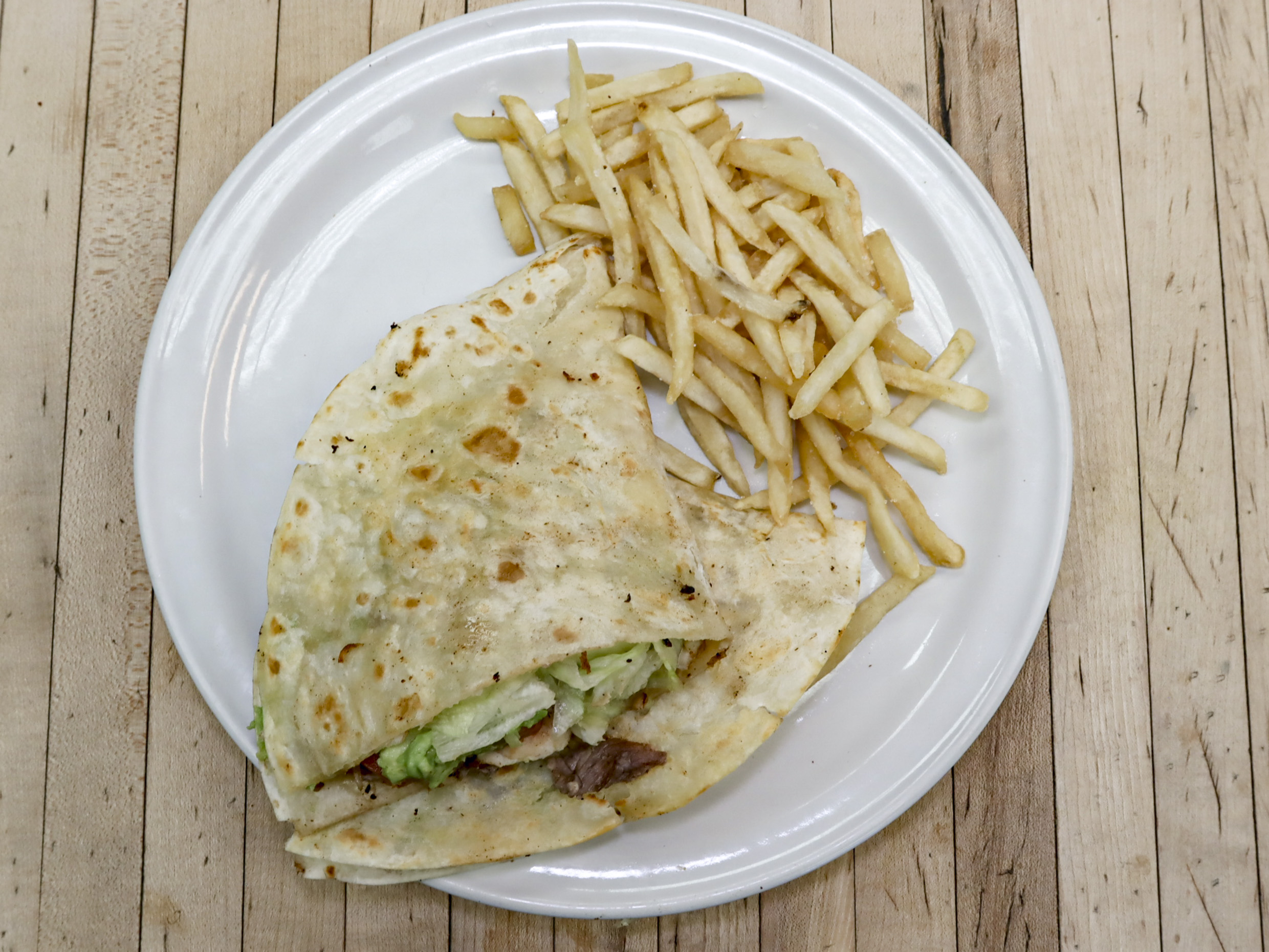 Quesadilla grande de Carne asada y peshuga de pollo con lechuga ,tomate y aguacate.