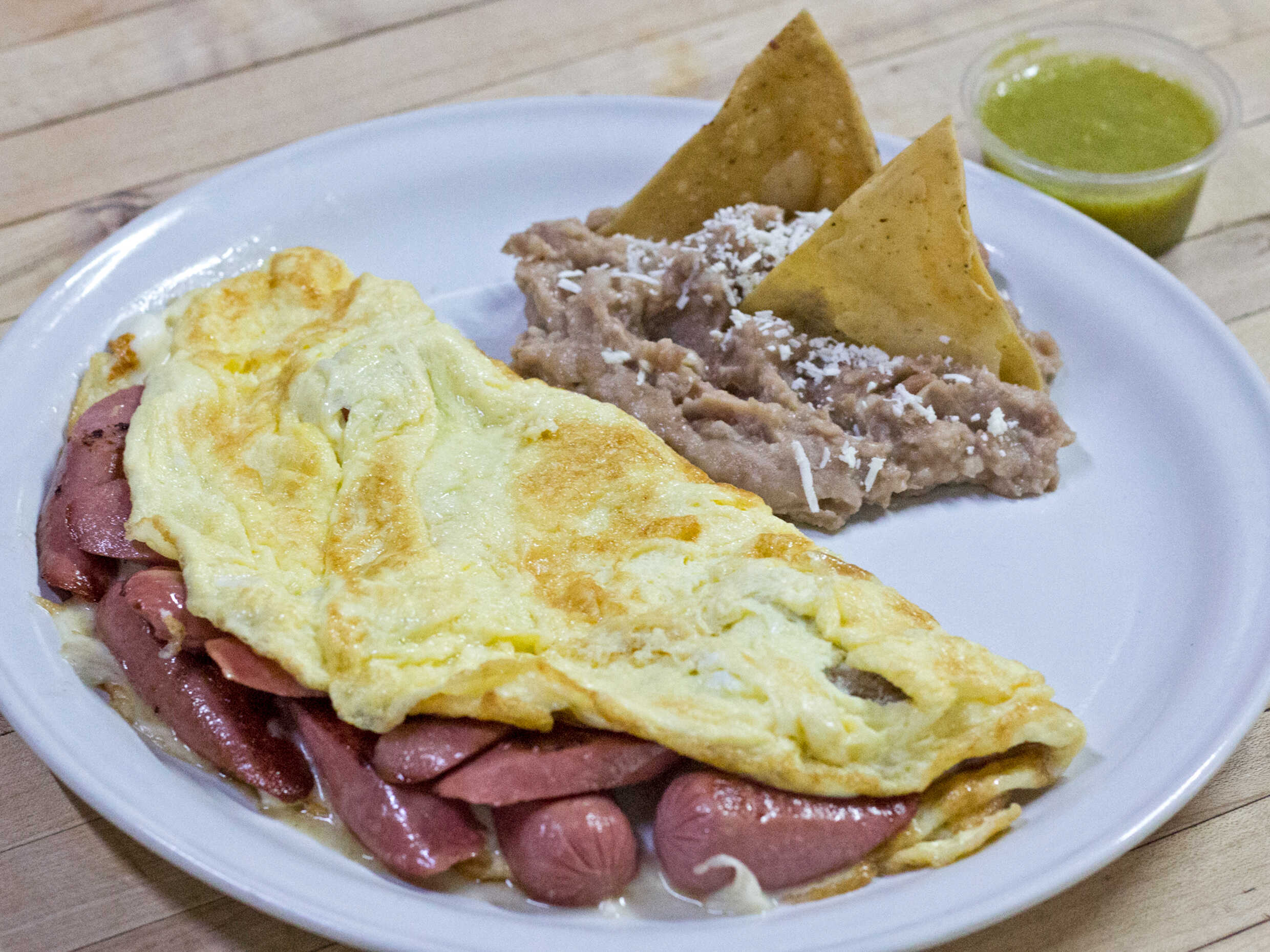 Omelette con queso Monterrey , jamon de pavo ,acompañado de arroz , frijoles ,tortillas y salsita picosa.