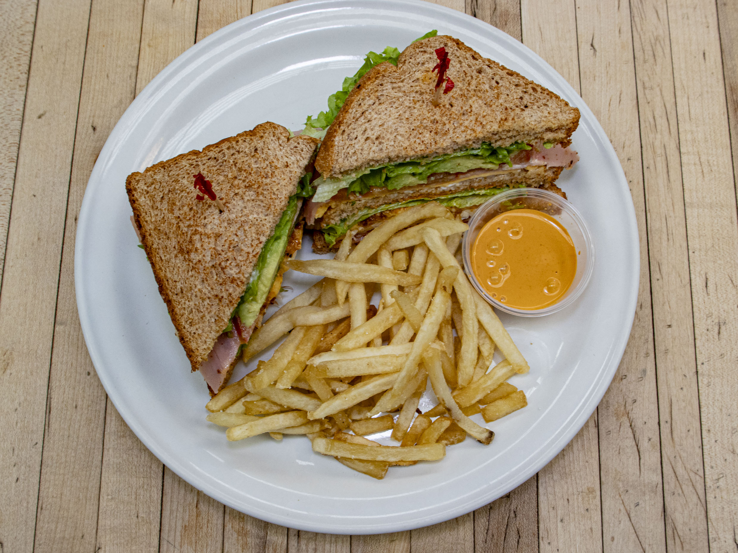 Rica torta de jamón de pavo, queso americano, tomate, aguacate y lechuga