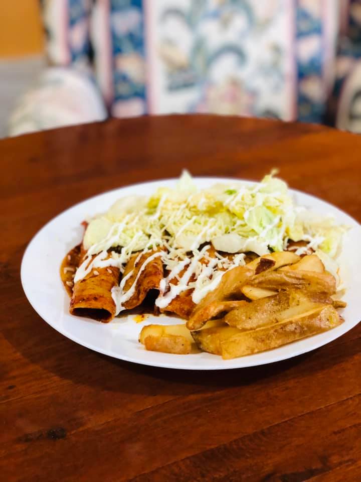 Orden de cuatro enchiladas rellenas con pechuga, acompañadas con arroz y frijoles