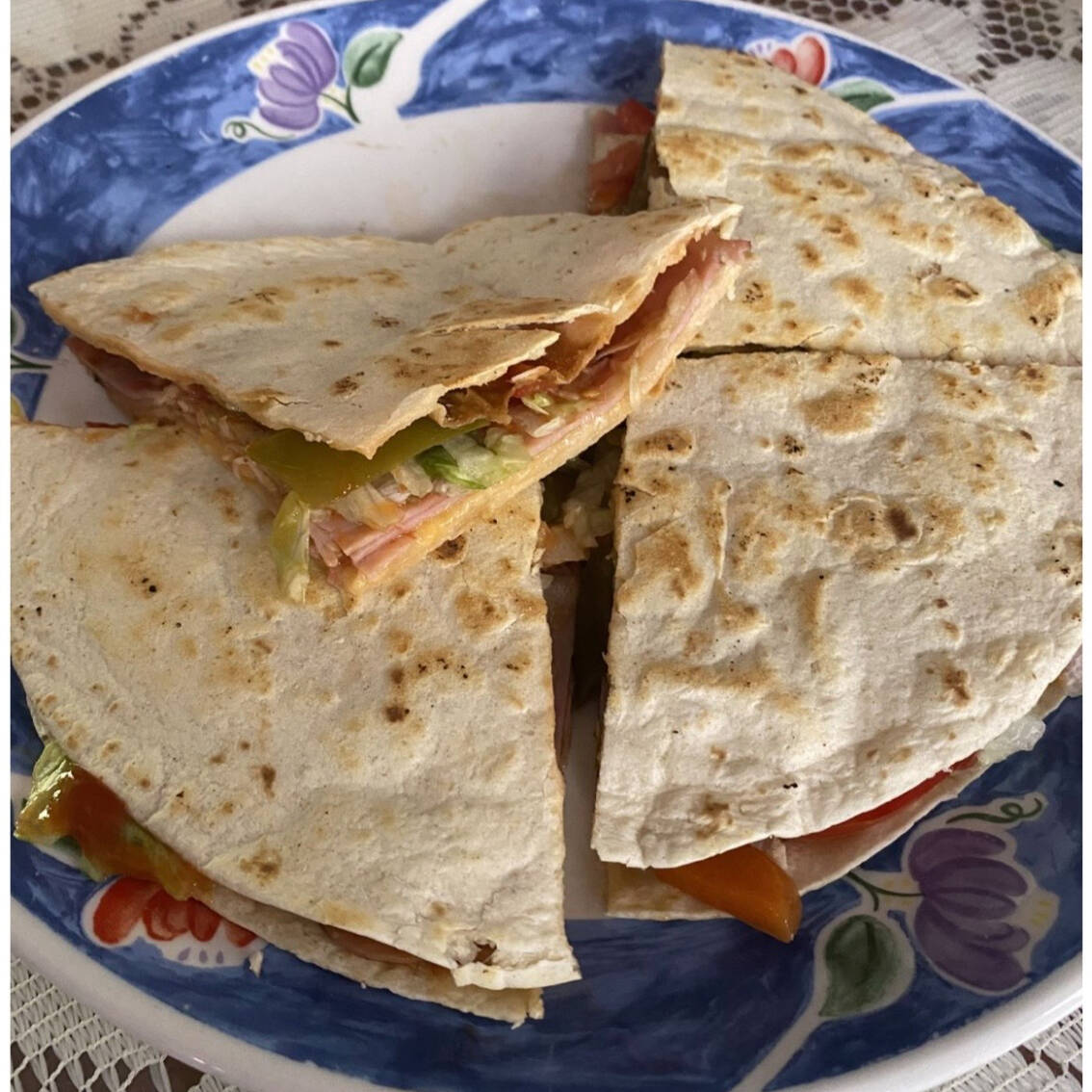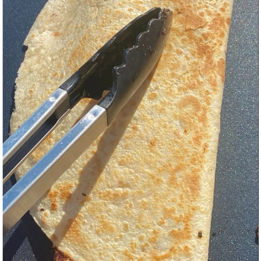 Tortilla de Harina, rellena de queso Milanesa frita acompañada de lechuga, jitomate, cebolla, aguacate, crema