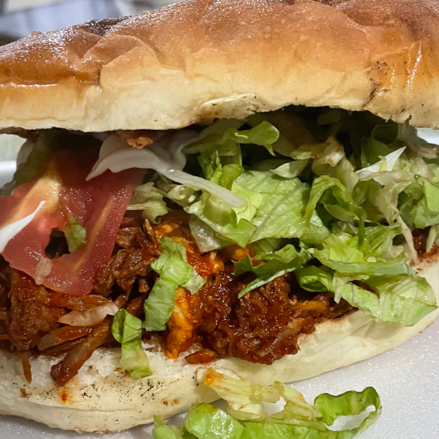 Pan Artesanal, Pierna Deshebrada Sazonada, Lechuga, Jitomate, Cebolla,Chiles en vinagre y crema.