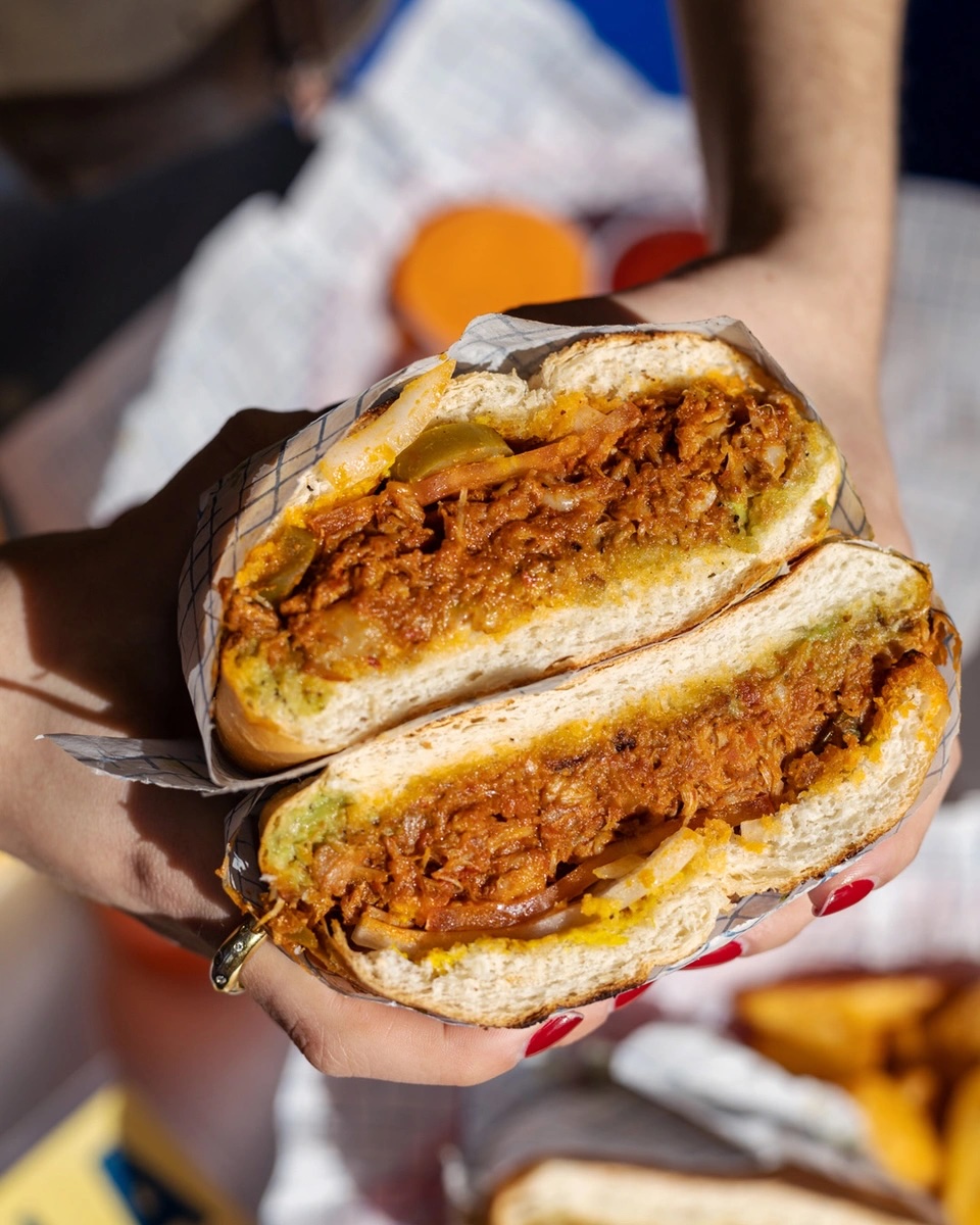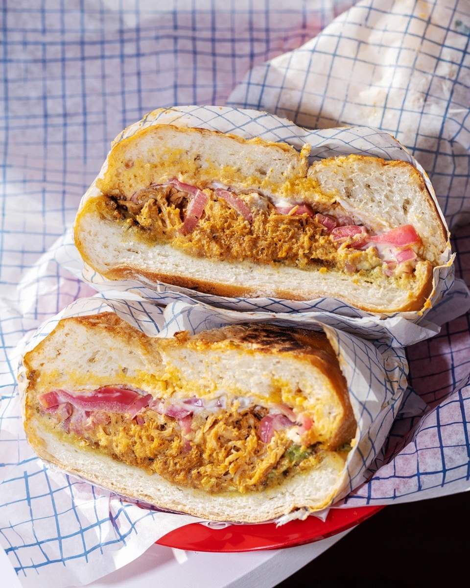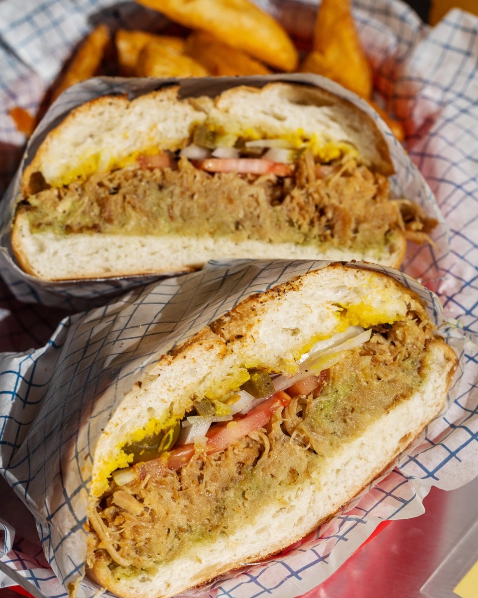 Carnitas, aguacate, tomate, cebolla, jalapeño, mostaza, mayonesa.