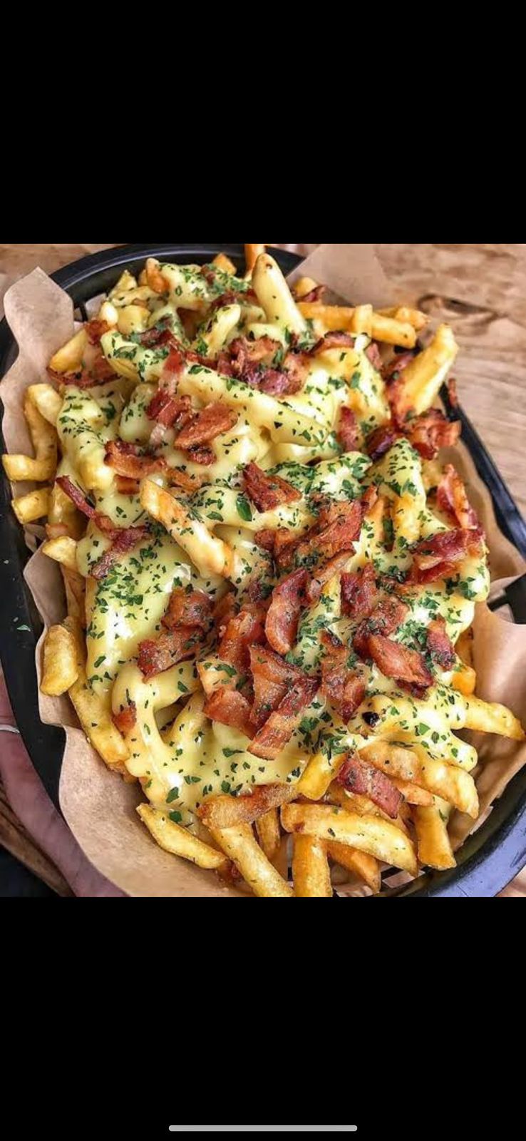 papas ftitas bañadas en queso amarillo acompañado de salchicha y tocino frito