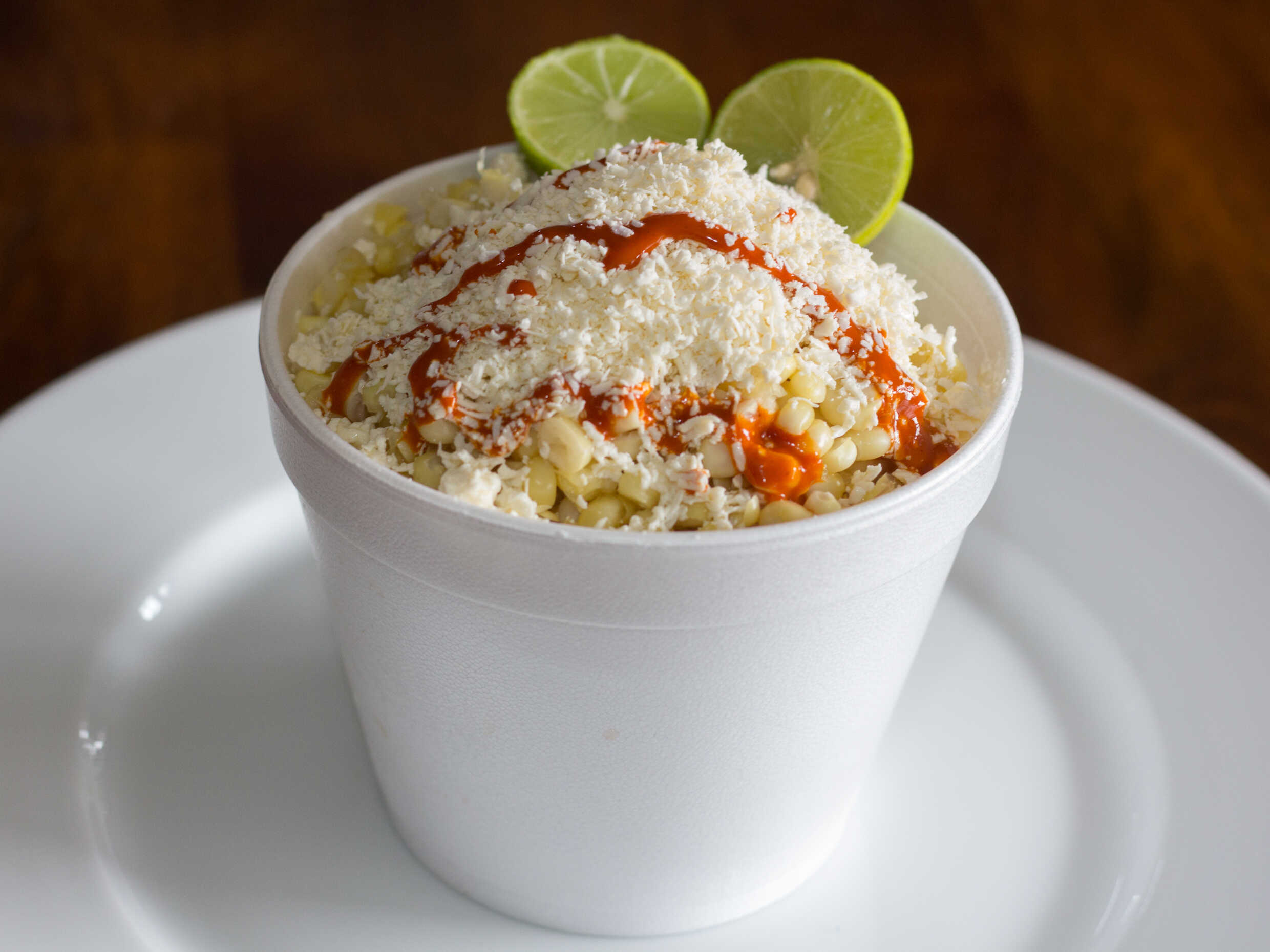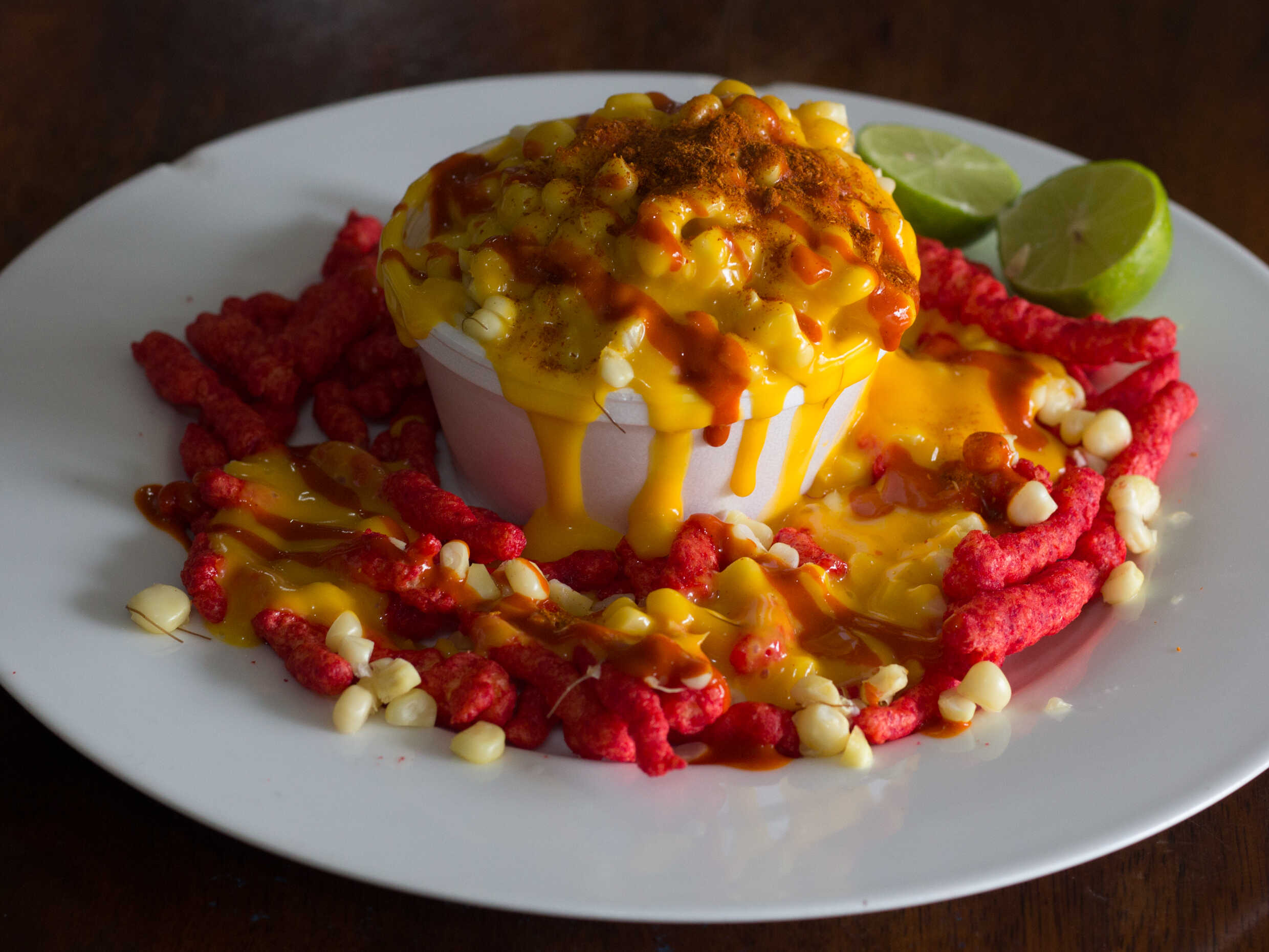 Tostitos con elote, mayonesa, mantequilla, queso, limón, chile en polvo y liquido.