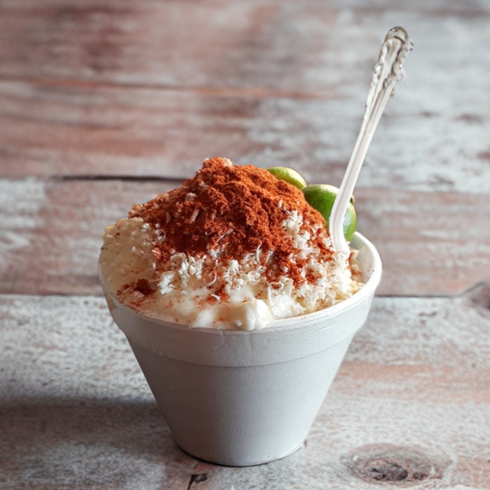 Vaso de elote mediano con mayonesa, mantequilla y queso.