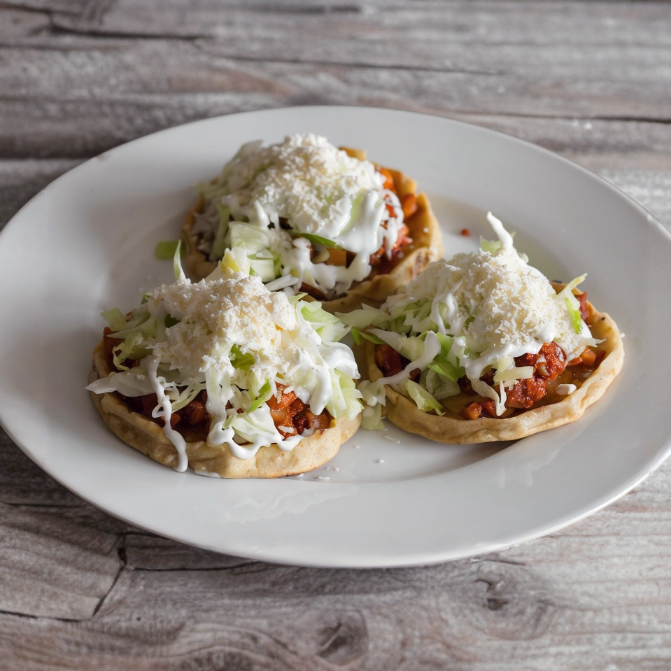 Tortilla gruesa y ancha picada por las orillas a la que se le pueden añadir diferentes guisos a elegir, llevan lechuga, queso y crema.