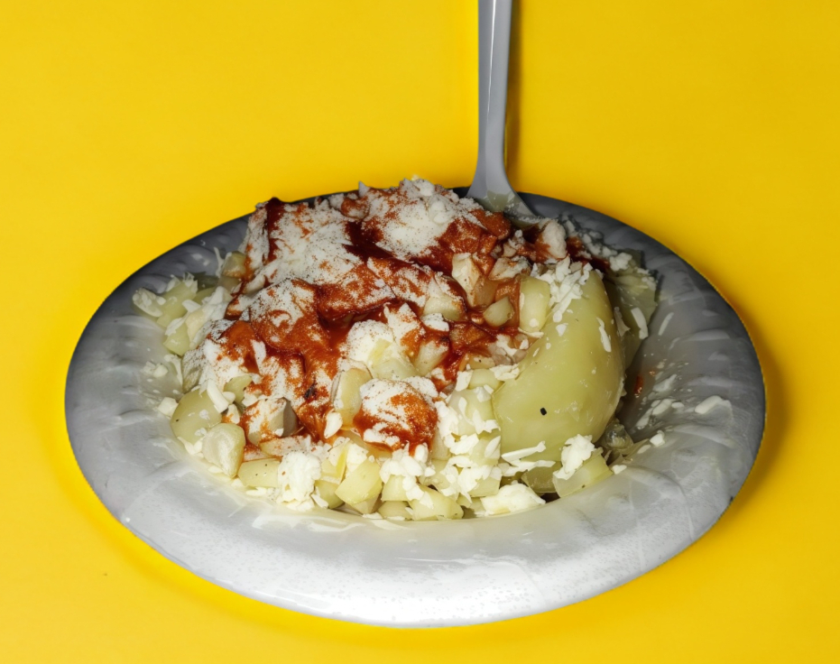 Papa hervida con mayonesa, mantequilla, queso, crema y elote