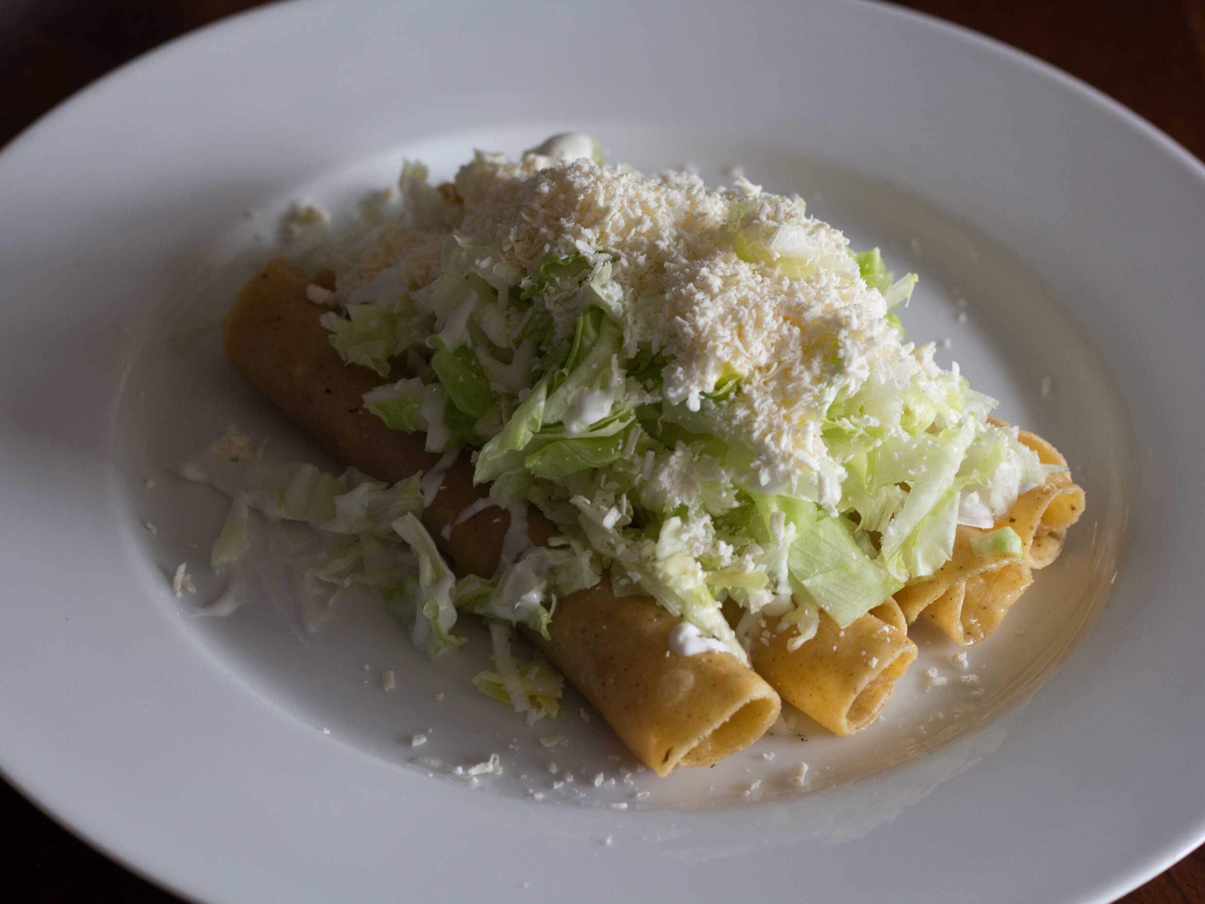 Tacos dorados rellenos de carne deshebrada con lechuga, queso y crema.
