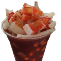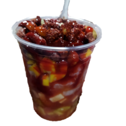 Pepino, jícama, cuerito, mango(temporada),,chaca chaca(dulce de tamarindo) ,clamato(el original) ,salsa(botanera) ,chamoy (mega), tajín y limón