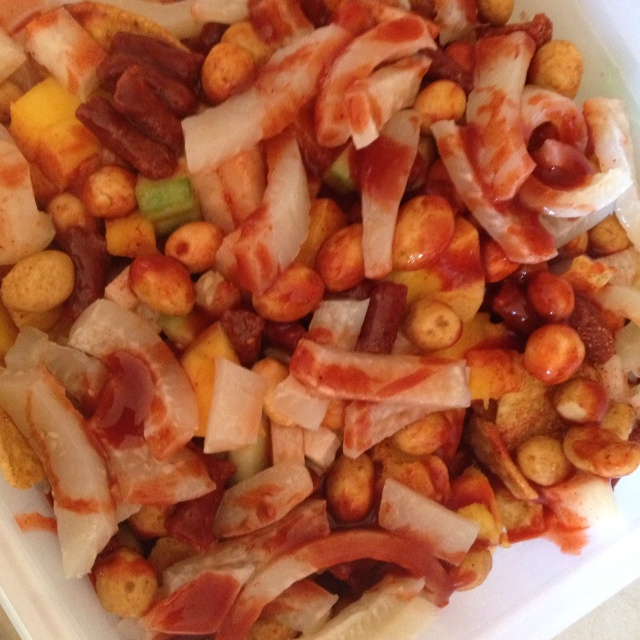 2tosti ,Pepino, jícama, cuerito, mango(temporada), cacahuate, chaca chaca, clamato (el original), salsa(botanera), chamoy(mega), tajín y limón