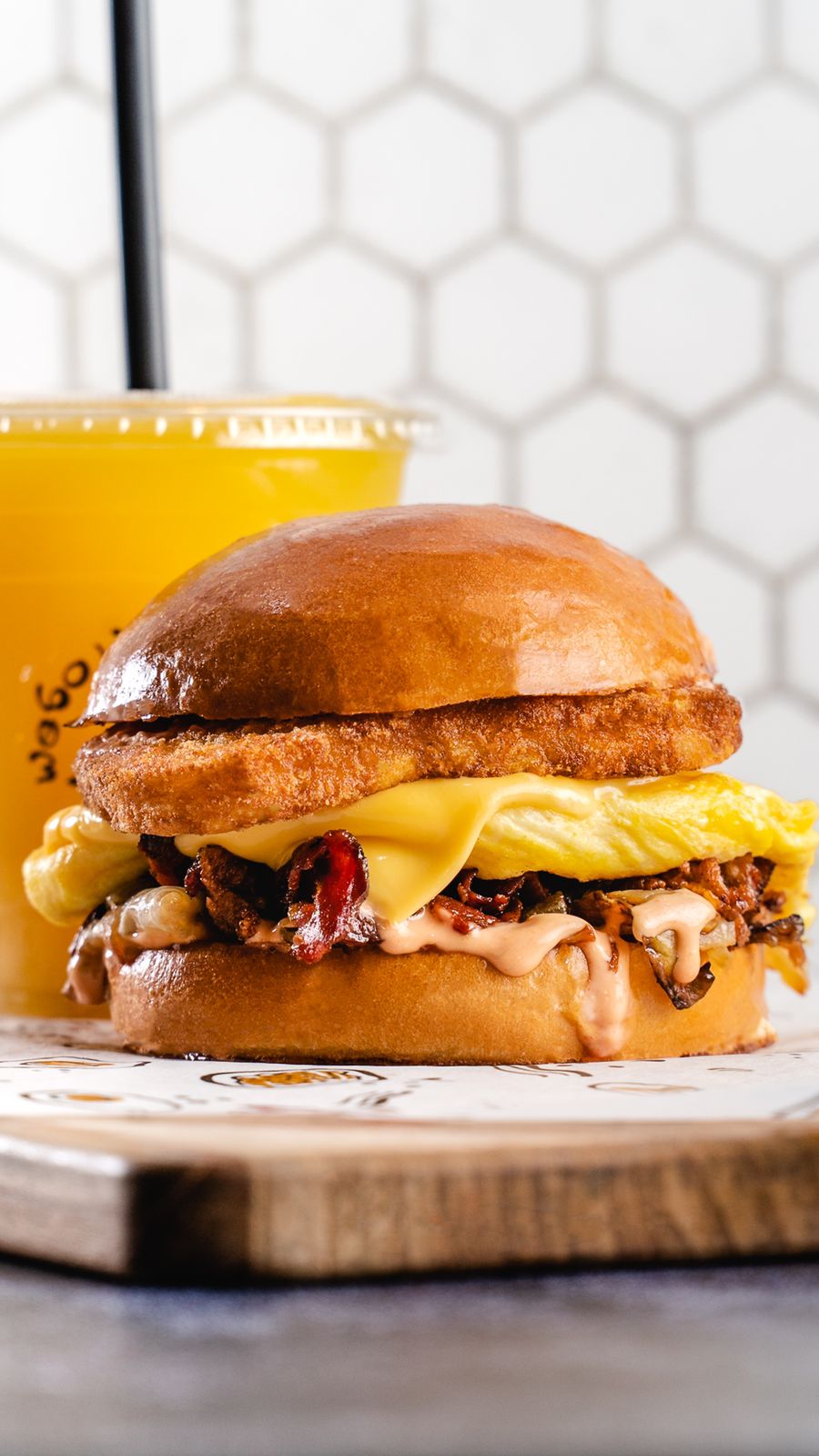 Dos huevos al gusto, cortes de tocino grueso, papa hashbrown, queso cheddar, cebolla caramelizada y salsa asian spicy en pan brioche caliente.