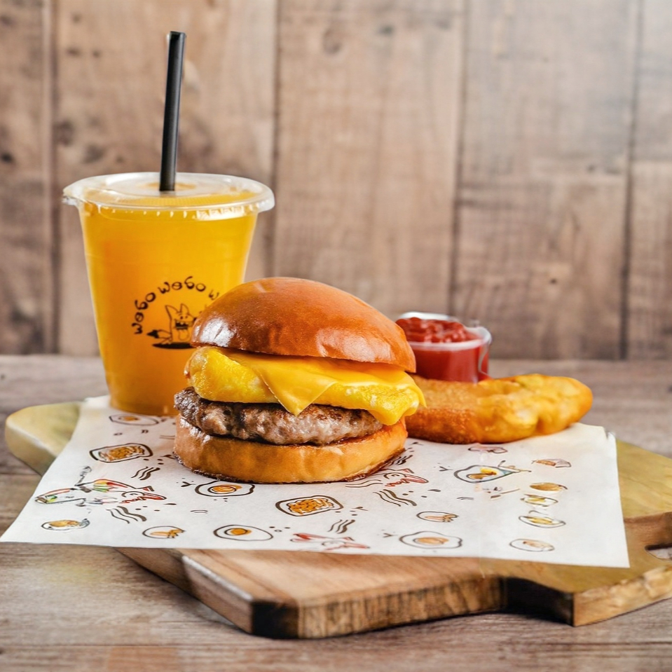 Dos huevos al gusto, sausage pattie, queso cheddar, aderezo y cátsup en pan brioche caliente.