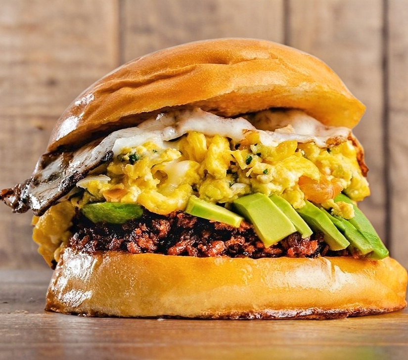 Dos huevos revueltos a la mexicana (tomate, cebolla y cilantro), aguacate, aderezo, queso mozzarella y chorizo en pan brioche caliente.