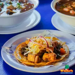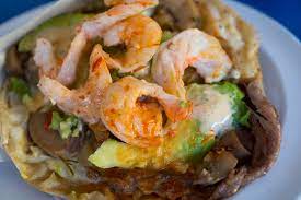TORTILLA DE MAIZ O HARINA, CAMA DE QUESO, CAMARON COCIDO, SALSA RECETA DE LA CASA CON MAS DE SEIS CHILES