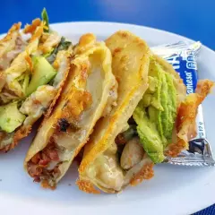QUESADILLA DORADA RELLENA DE UNA EXQUISITA COMBINACIÓN DE CAMARON CON CEBOLLA BLANCA Y CHILE CALIFORNIA, ACOMPAÑADA CON AGUACATE
