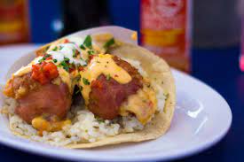ES UN TACO ACOMPAÑADO CON DE ARROZ BLANCO, TRES BOLITAS CON CAMARON ENVUELTO EN MARLIN Y TOCINO DORADO, ACOMPAÑADO CON CHIPOTLE & UNOS TOQUES DE CHILE MORRON