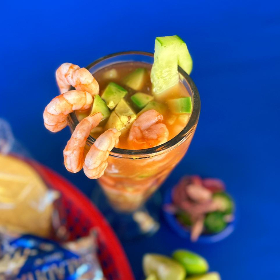 FRESCO COCTEL DE CAMARONES COCIDOS, COMBINADO CON CEBOLLA MORADA, PEPINO AGUACATE Y NUESTRA DELICIOSA RECETA DE CALDO DE COCTEL