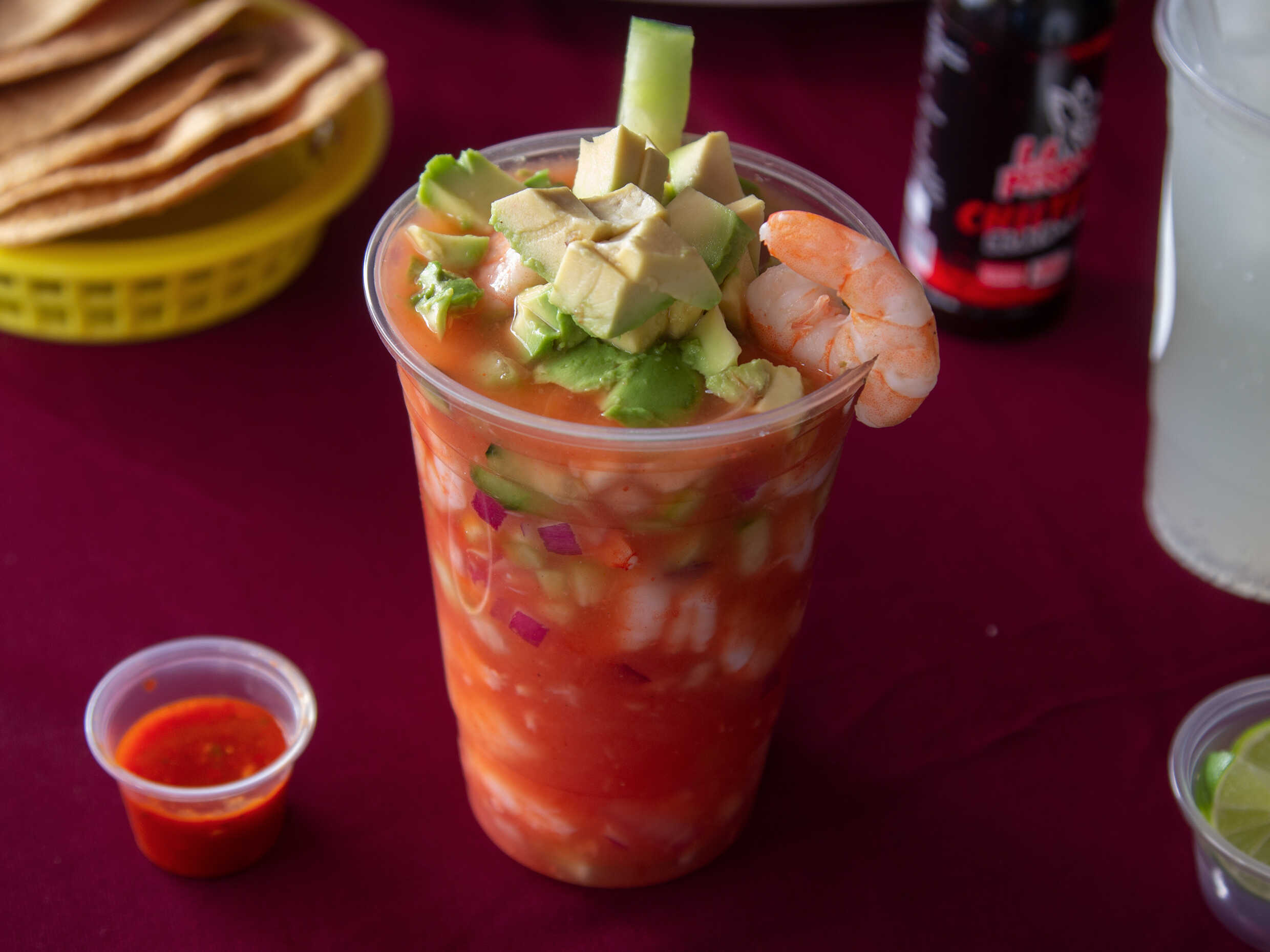 FRESCOS CAMARÓN CURTIDOS EN LIMÓN BAÑADOS EN SALSA PICANTE A LA ELECCIÓN (ROJA, VERDE O NEGRA) ACOMPAÑADOS DE CEBOLLA MORADA AGUACATE Y PEPINO.