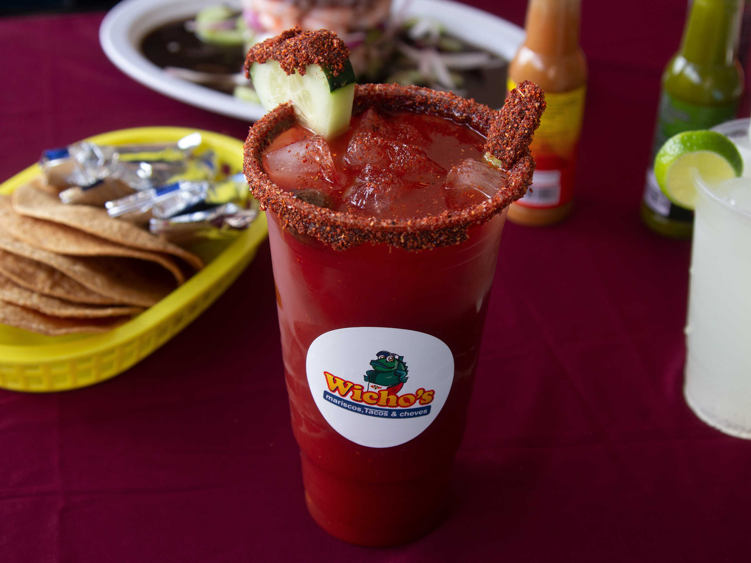 FRESCA COMBINACIÓN DE MARISCOS (CAMARÓN COCIDO, CAMARÓN CURTIDO, PULPO, OSTIÓN, ALMEJA, PATA DE MULA) BAÑADOS CON LA RECETA DE LA CASA A BASE DE CLAMATO CON CEBOLLA MORADA PEPINO Y AGUACATE