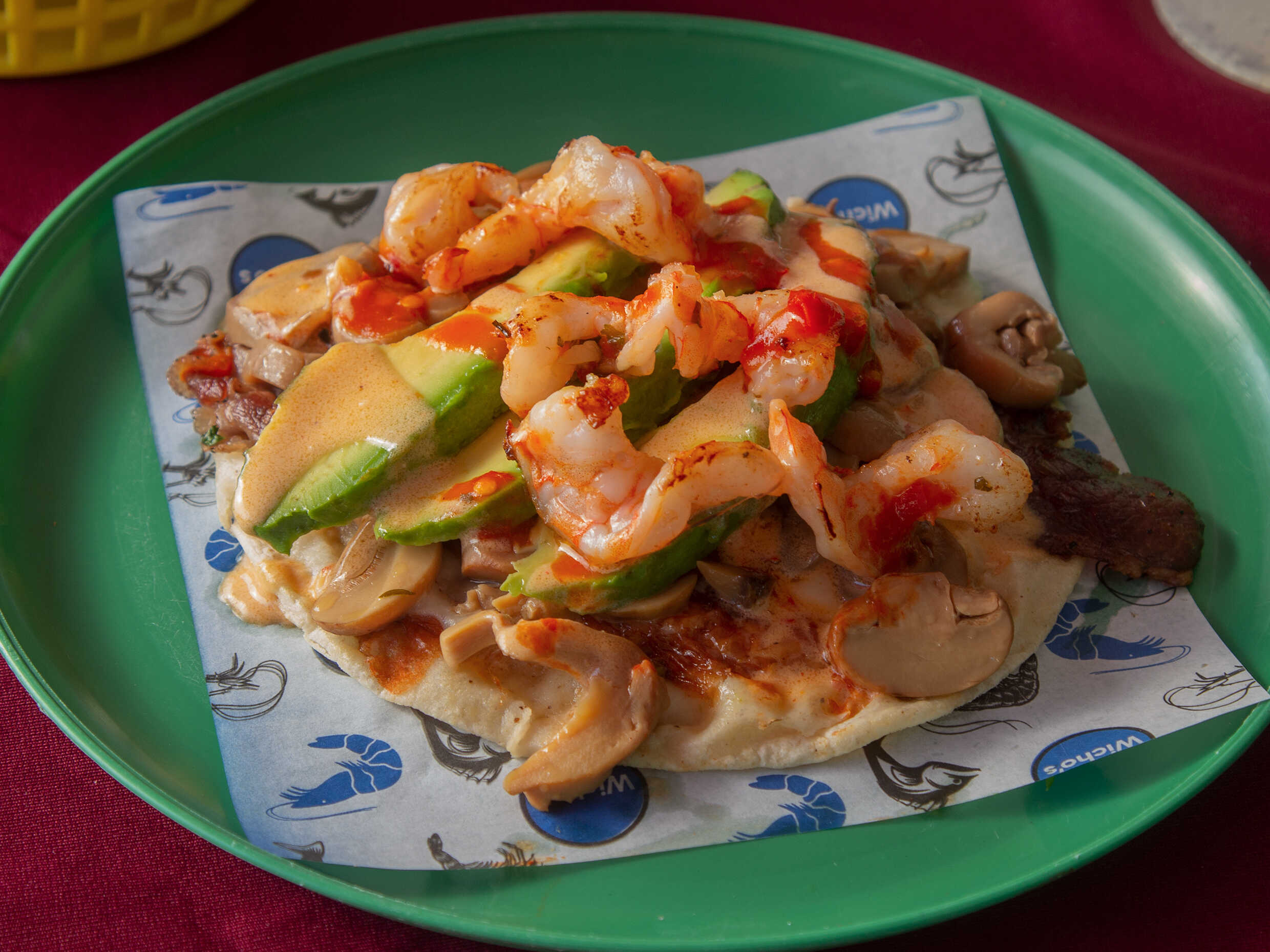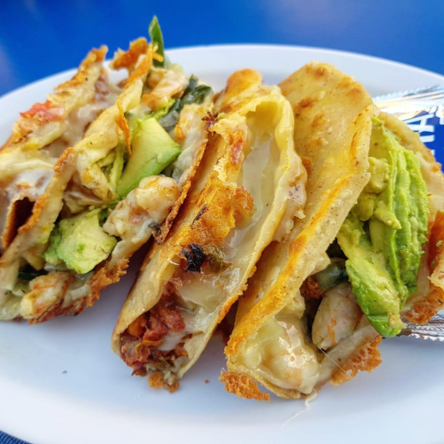 EXQUISITA QUESADILLA CON CAMARÓN COCIDO AL MOMENTO ACOMPAÑADO DE REPOLLO Y MEXICANA
