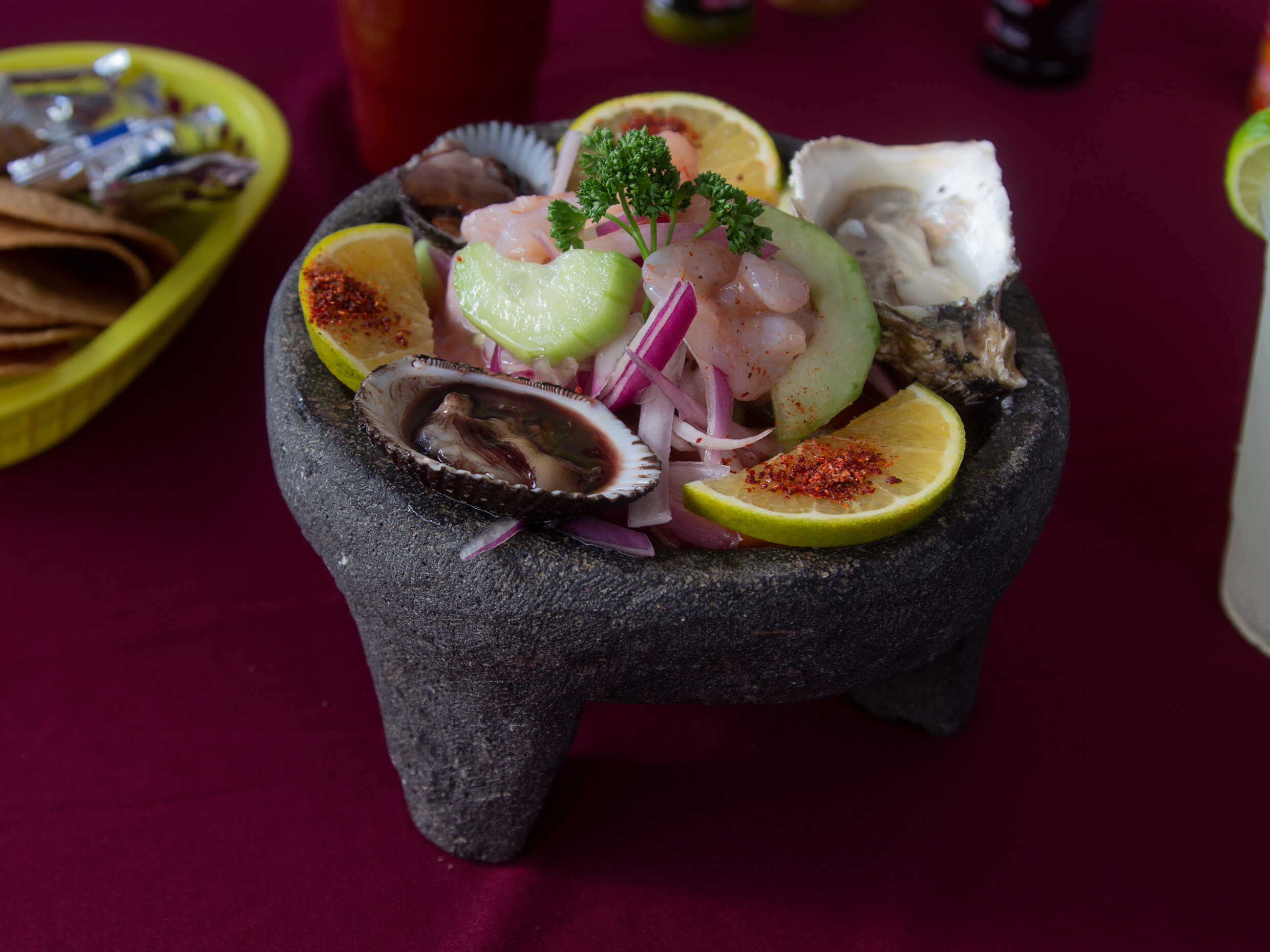 LA MEJOR COMBINACIÓN DE MARISCOS FRESCOS (CEVICHE DE PESCADO, CEVICHE DE CAMARÓN, ALMEJA FRESCA PREPARADA, CAMARÓN COCIDO, PULPO, OSTIONES Y PATA DE MULA) ACOMPAÑADOS CON CEBOLLA MORADA Y PEPINO